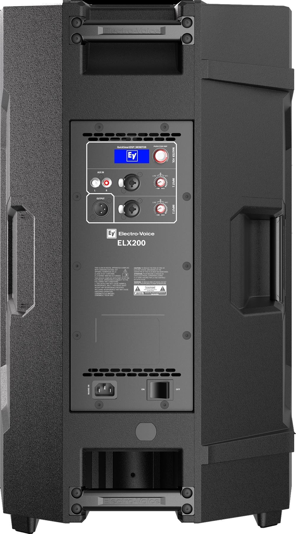 ELX200-15P features high-efficiency Class-D power amplifiers (up to 1200 W) with integrated QuickSmartDSP, and delivers up to 132 dB SPL utilizing transducers designed and engineered by EV (15-inch EVS-15M woofer coupled with a DH-1C 1-inch titanium compression driver). Powered full-range models allow easy setup via four presets (Music, Live, Speech, Club), sub/top system-match crossovers, three-band EQ, five user-programmable presets (Store and Recall settings), visual monitoring of limiter status, input level control and meters, and master volume control to ensure optimal gain structure.