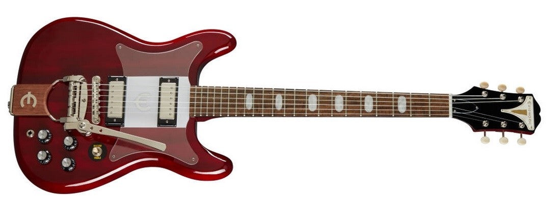 The Crestwood first appeared in 1958 and in slightly modified form in 1959 as the Crestwood Custom; it was Epiphone's first original solid body electric guitar design. The new Epiphone Crestwood Custom returns to its roots with features that harken back to the early models including a symmetrical double cutaway mahogany body with two Epiphone PRO Mini Humbucker pickups, three on a side reduced sized Kalamazoo headstock with Epiphone Bikini badge and ivory button Epiphone Deluxe tuning machines, and a clear butterfly pickguard with white center stripe and foil E logo. The Crestwood Custom comes equipped with a glued-in mahogany neck with a medium C profile, Indian laurel fretboard with 12" radius, 22 medium jumbo frets and Epiphone oval inlays, 2 volume and 2 tone controls with CTS potentiometers and an Epiphone LockTone Tune-O-Matic bridge with Graph Tech TUSQ saddles and Tremtone vibrato tailpiece.