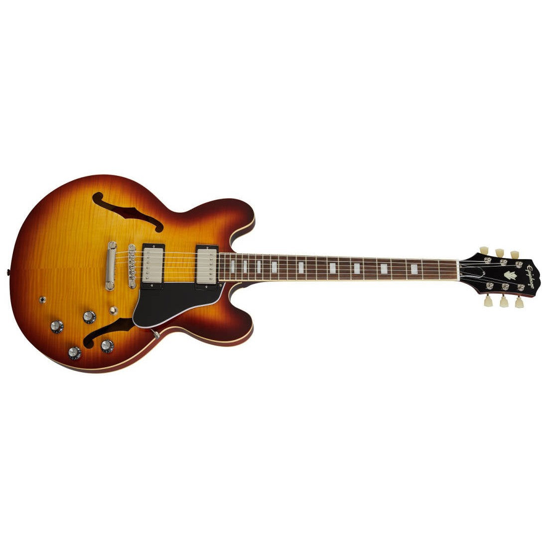 The Epiphone "Inspired by Gibson" ES-335 Figured honours the immortal ES-335, the thin semi-hollow archtop that brought archtop class to the rock era. Featuring a solid maple center block for added sustain and feedback resistance, Alnico Classic PRO™ humbuckers, Grover® Rotomatic® tuners, and a maple veneer top and back in stunning Blueberry Burst and Raspberry Tea Burst gloss finishes that are sure to turn heads.