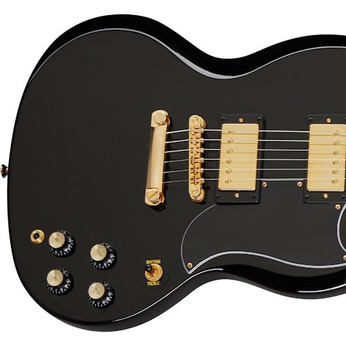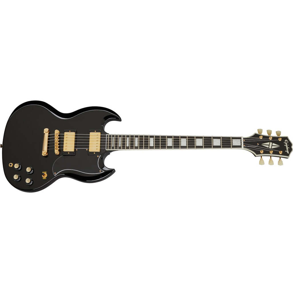 The Epiphone SG Custom from the new Inspired by Gibson Collection recreates the legendary 1960s era SG with LP•Custom style binding that became a hard rock and heavy metal classic. The SG debuted in 1961 to replace the Les Paul which had been temporarily discontinued because of low sales. The SG Custom features an Ebony fingerboard, LP Custom style inlay, gold hardware, and Alnico Classic PRO™ humbuckers with CTS electronics. Available in an Ebony.