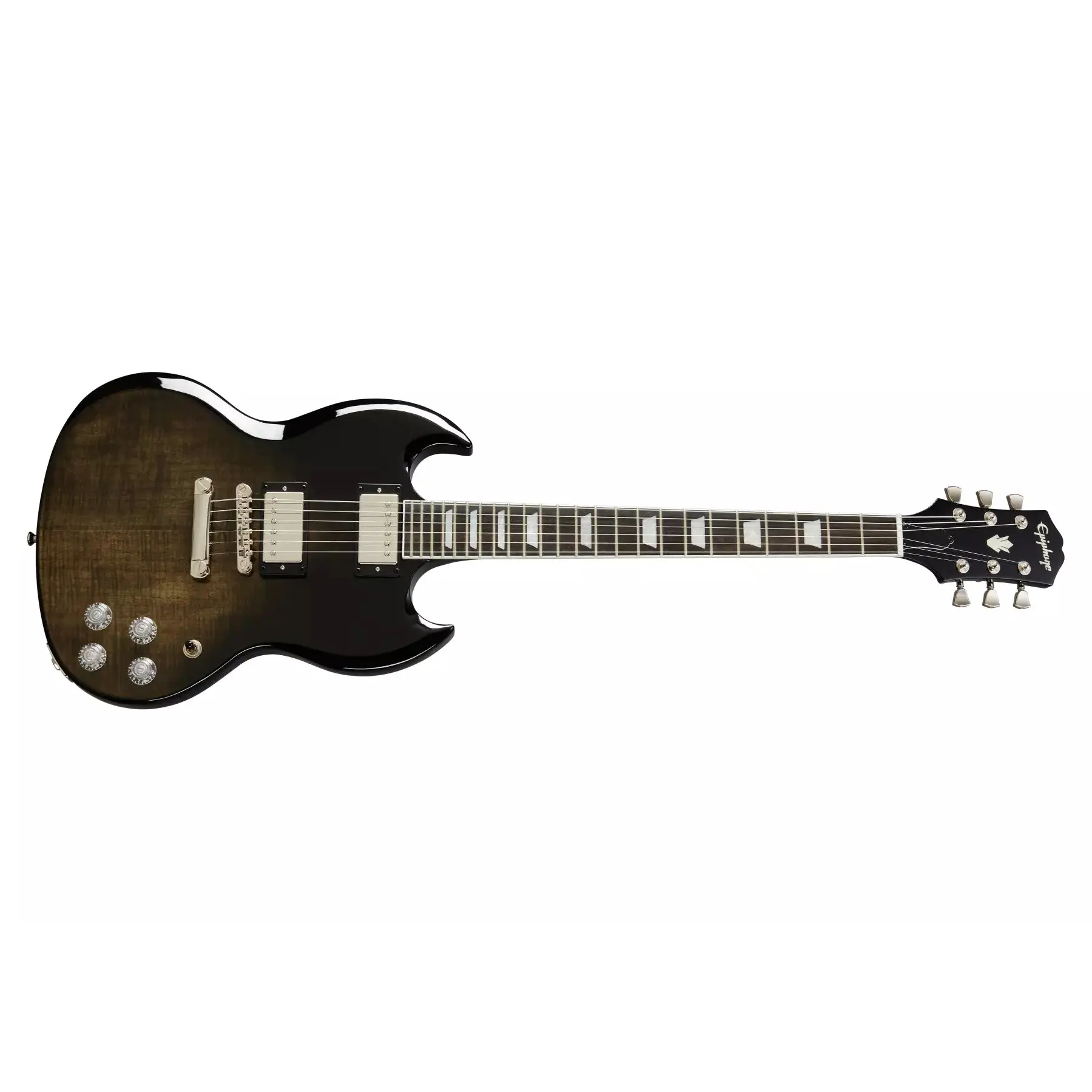 The SG Modern Figured from Epiphone's "Inspired by Gibson" Collection has a classic SG profile made from mahogany with a AAA flame maple veneer top and Trans Black Fade finish. Powered by ProBucker™ humbuckers with coil-splitting, phase switching, and CTS electronics. Featuring an ebony fingerboard and world-class Grover® locking Rotomatic tuners with tulip buttons with an 18:1 ratio.