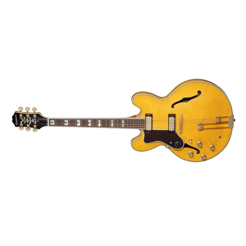 One of Epiphone's most storied guitars, the Sheraton returns in both Vintage Sunburst and Natural finishes and in right or left-handed versions. This elegant instrument features a semi-hollow body crafted from layered maple with a maple centerblock for feedback resistance. The 22-fret, mahogany neck has a bound Indian laurel fretboard with block mother of pearl with abalone triangle inlays. The bound headstock has a historic Epiphone logo and tree of life in mother of pearl.
