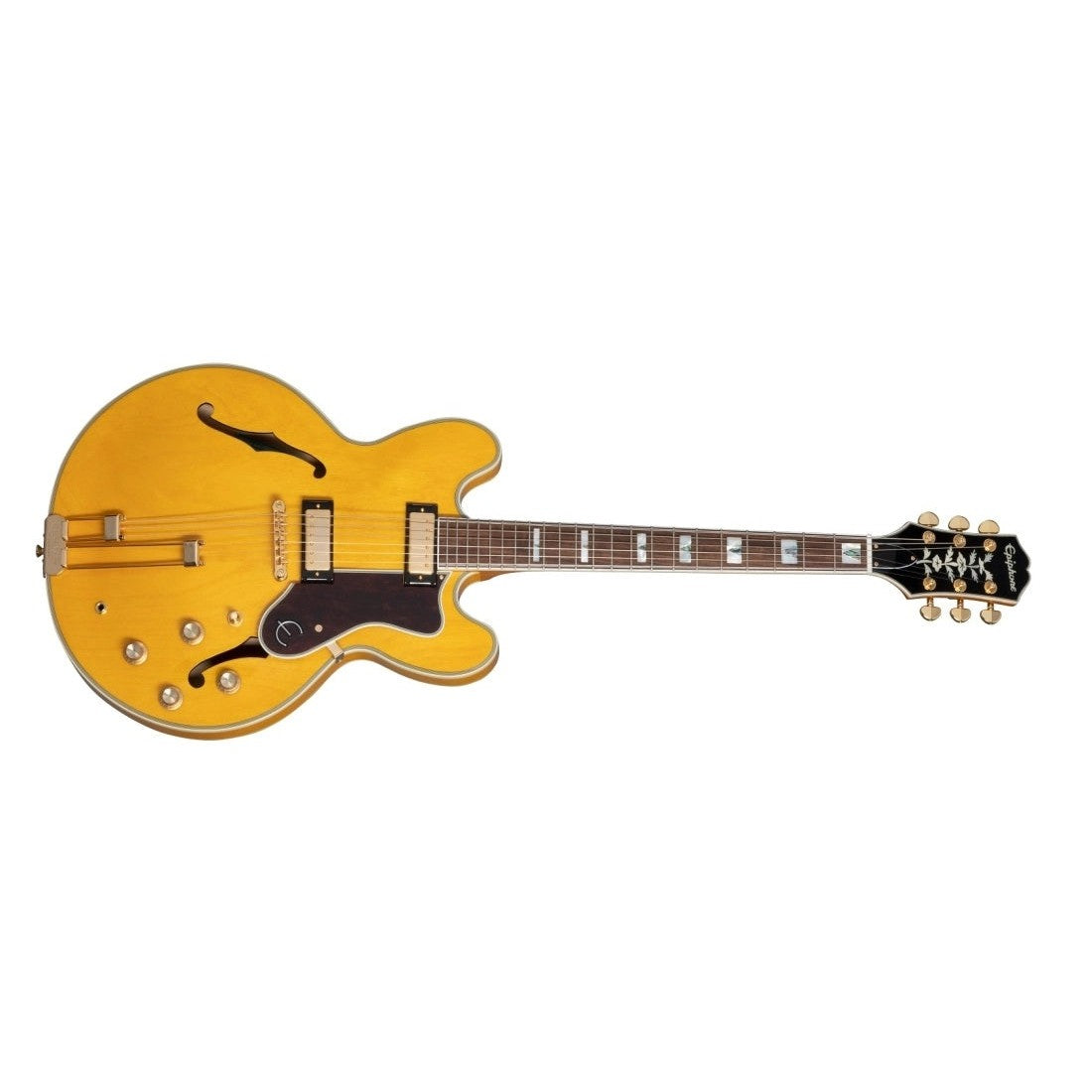 One of Epiphone's most storied guitars, the Sheraton returns in both Vintage Sunburst and Natural finishes and in right or left-handed versions. This elegant instrument features a semi-hollow body crafted from layered maple with a maple centerblock for feedback resistance. The 22-fret, mahogany neck has a bound Indian laurel fretboard with block mother of pearl with abalone triangle inlays. The bound headstock has a historic Epiphone logo and tree of life in mother of pearl.