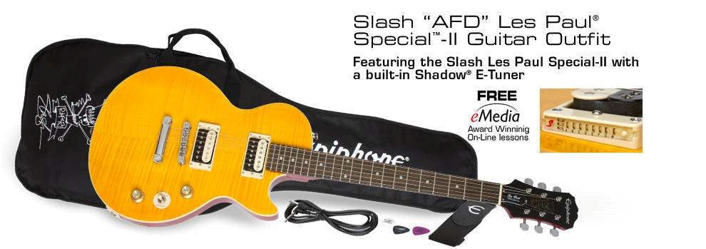 Epiphone is proud to present the new Slash AFD (Appetite for Destruction) Guitar Outfit for beginners and pros alike featuring a Slash-designed Les Paul Special II in classic Appetite Amber finish with premium gigbag plus custom Slash signature picks and free online lessons from eMedia.