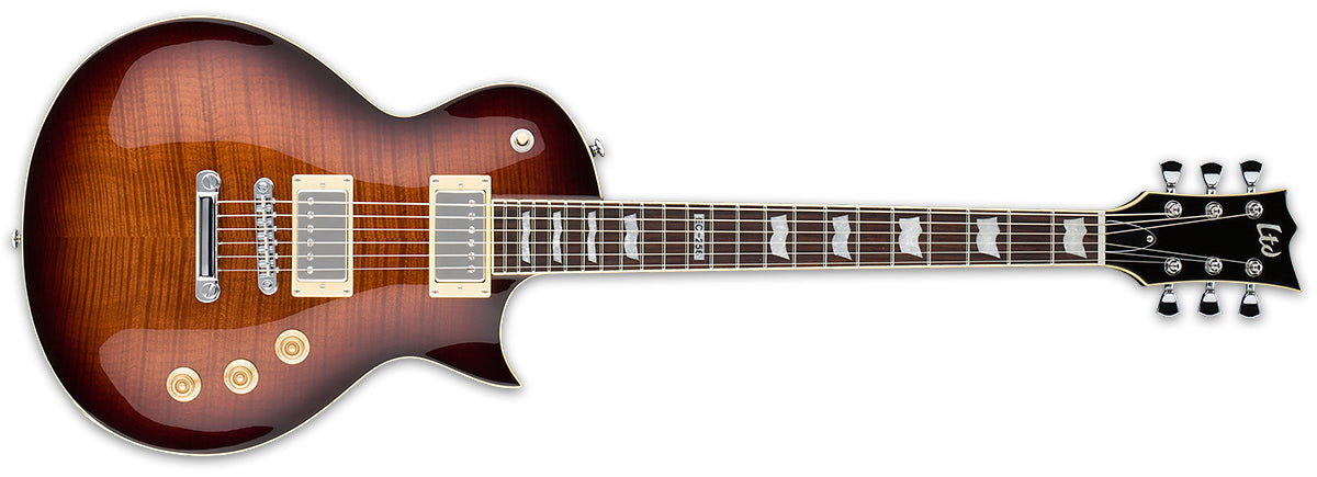 SPECIFICATIONS CONSTRUCTION Set-Neck SCALE 24.75" BODY Mahogany TOP Flamed Maple NECK 3Pc Mahogany FINGERBOARD Roasted Jatoba FINGERBOARD RADIUS 350mm FINISH Dark Brown Sunburst NUT WIDTH 42mm NUT TYPE Molded NECK CONTOUR Thin U FRETS/TYPE 22 XJ HARDWARE COLOR Chrome STRAP BUTTON Standard TUNERS LTD BRIDGE TOM & Tailpiece NECK PU ESP Designed LH-150N BRIDGE PU ESP Designed LH-150B ELECTRONICS Passive ELECTRONICS LAYOUT Vol/Vol/Tone(P/P)/Toggle Switch