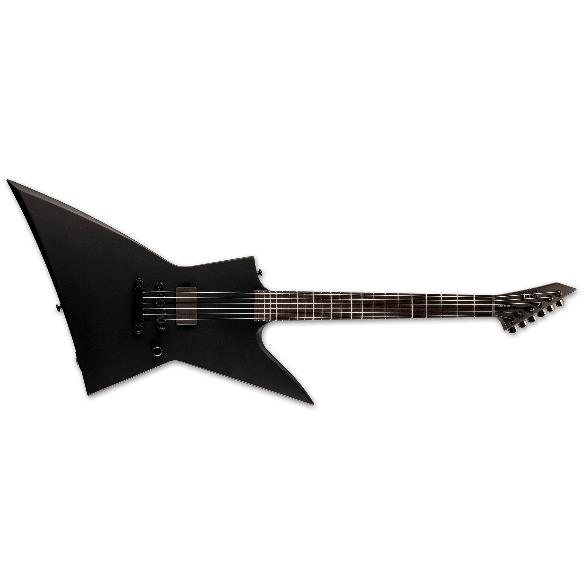 The LTD Black Metal Series is comparable in build quality to our LTD Deluxe “1000 Series” instruments, but with a dark and menacing design theme of all-black finish, components, and hardware, a single premium-quality pickup, Macassar ebony fingerboards with no inlays and glow-in-the-dark side markers, and even a newly-designed black metal LTD logo on the headstock. The EX Black Metal features set-thru construction, 22 extra-jumbo stainless steel frets, a TonePros locking bridge and tailpiece, and a single direct-mount EMG 81 pickup with black logo.