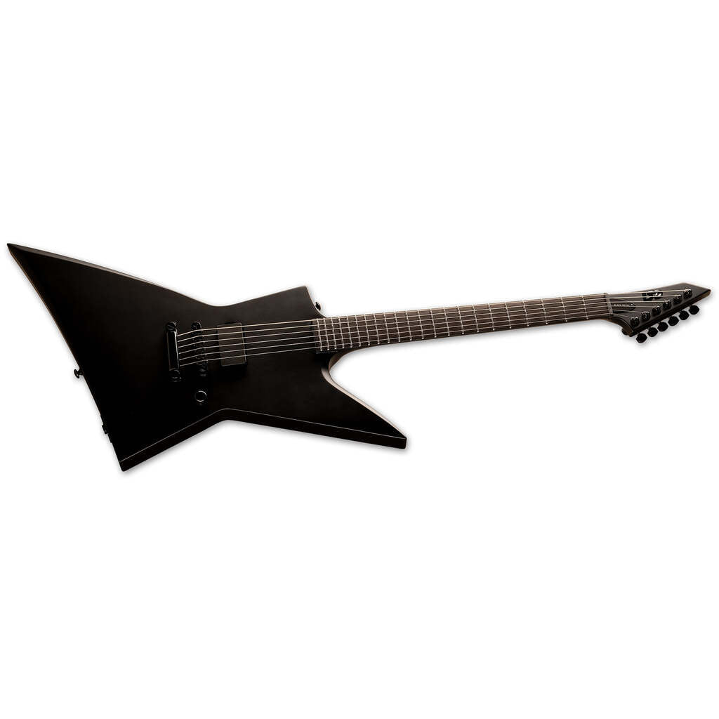 The LTD Black Metal Series is comparable in build quality to our LTD Deluxe “1000 Series” instruments, but with a dark and menacing design theme of all-black finish, components, and hardware, a single premium-quality pickup, Macassar ebony fingerboards with no inlays and glow-in-the-dark side markers, and even a newly-designed black metal LTD logo on the headstock. The EX Black Metal features set-thru construction, 22 extra-jumbo stainless steel frets, a TonePros locking bridge and tailpiece, and a single direct-mount EMG 81 pickup with black logo.
