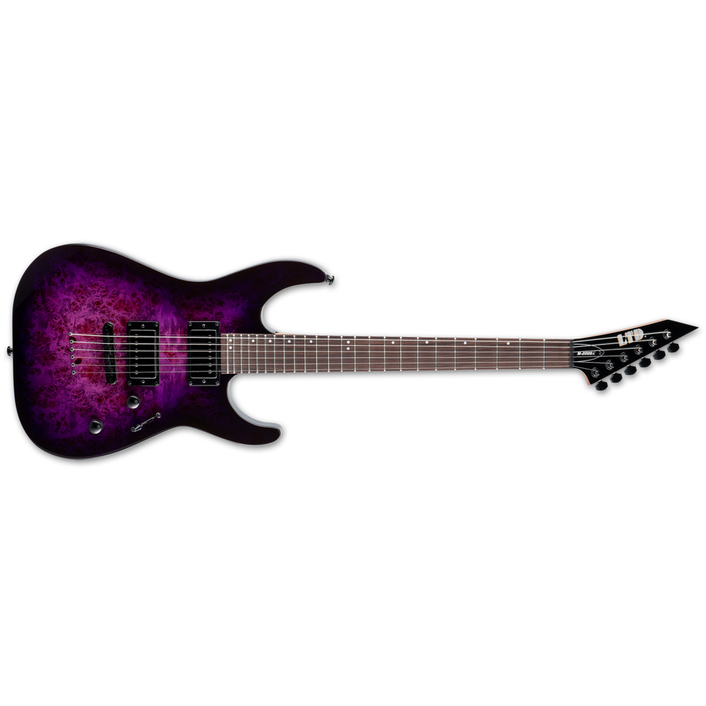LTD’s DX range allows for musicians to get access to a high-quality guitar at a price far less than its impressive features would imply. The M-200DX offers the streamlined M shape and then adds a great-looking burled poplar top on its light, resonant poplar body. Built with bolt-on construction at 25.5” scale, the M-200DX include classy features like a roasted maple neck, rosewood fingerboard, black chrome hardware, a TOM-style bridge with string-thru-body design, full body binding, offset dot inlays, and a reverse inline headstock. The M-200DX includes a set of our acclaimed ESP LH-150 humbucking pickups with matching black chrome covers in the bridge and neck positions, providing punchy, great tone for all genres of music. You also get the flexibility of single-coil tones controlled by a push-pull switch on the tone knob.