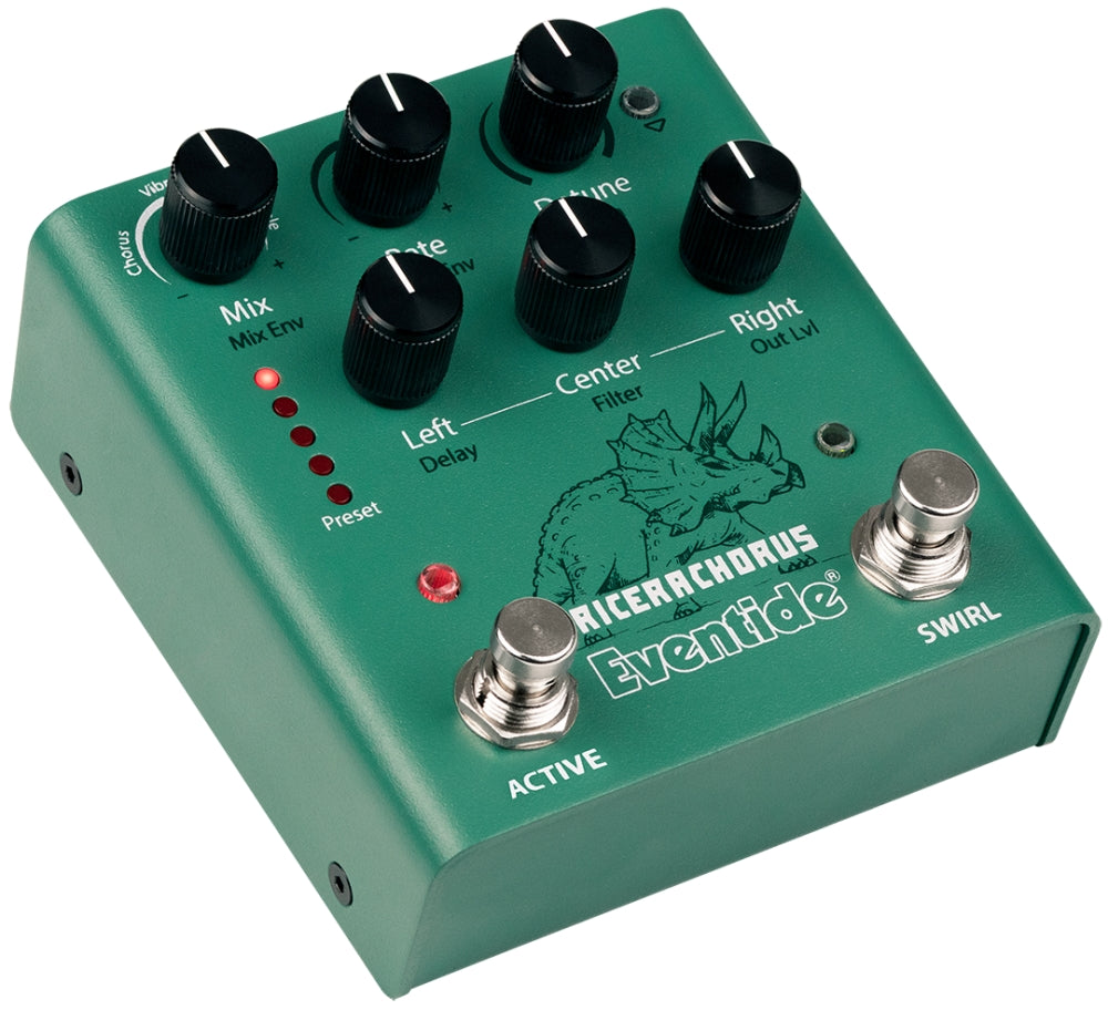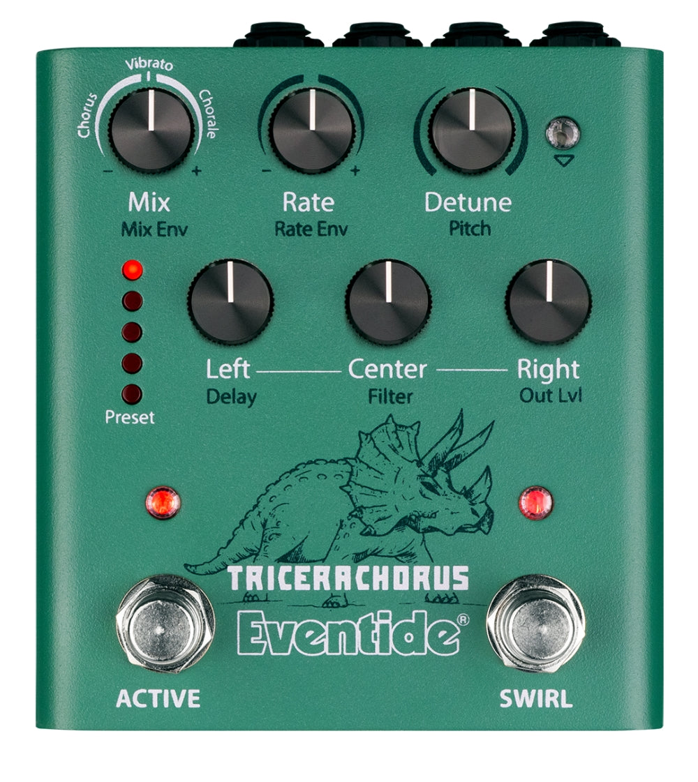 Like the mighty three-horned Dino, TriceraChorus is a powerhouse of chorus offering three effect types complemented by detuning and Swirl. For a quintessential vintage chorus sound, set TriceraChorus to “Chorus” mode. If you need something with more complexity and movement, “Chorale” produces lush, heavenly choruses inspired by classic rackmount Tri-chorus units. For a more warbly, pulsing effect, try “Vibrato.” Add detune for subtle pitch shifting sweetness. Engage the “Swirl” footswitch to get lost in a whirlpool of kaleidoscopic sound.