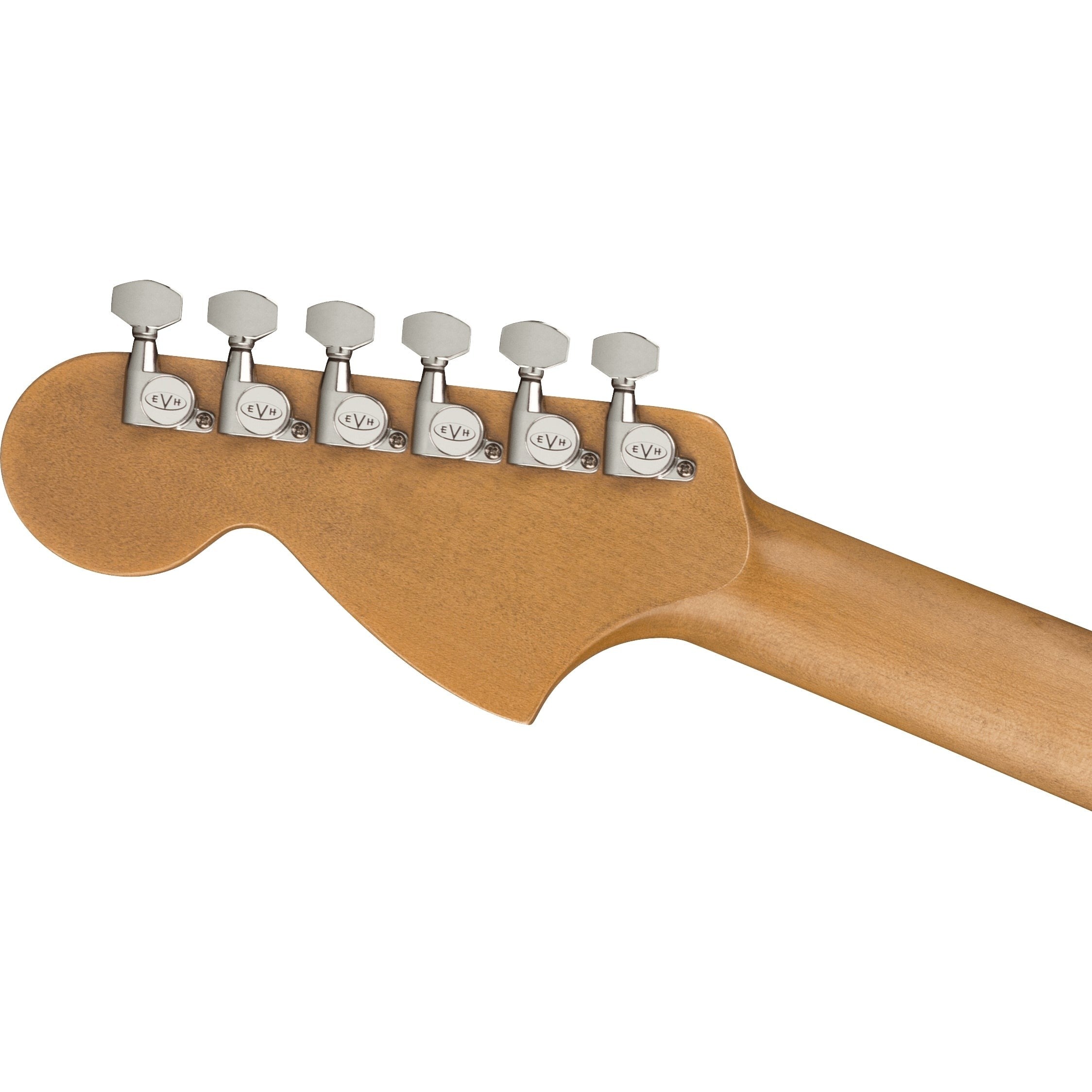 Other features include a skirted white Strat-style volume control knob (labeled “tone”) with 500K EVH Bourns® low friction pot and treble bleed circuit, black pickguard, chrome hardware, oversized strap buttons, EVH neck plate and larger, ‘70s-style licensed Fender Strat headstock with gold EVH logo.