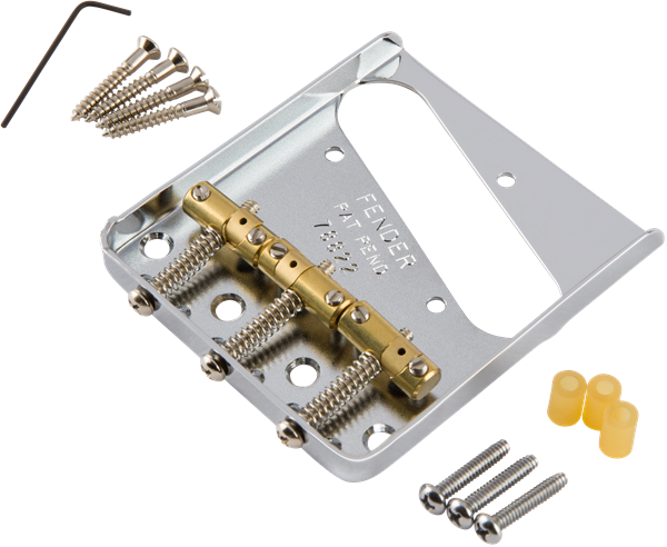 Plated-steel bridge (non-serialized). Bridge plate is stamped "Fender Pat. Pend. 77038". Package includes three compensated intonatable vintage-style brass saddles, slot-head saddle height screws, Philips head intonation screws, intonations springs, and four vintage-style slot-head bridge mounting screws. Package also includes saddle height adjustment wrench. String ferrules are sold separately.
