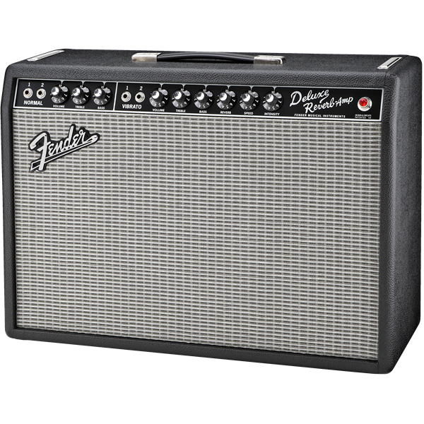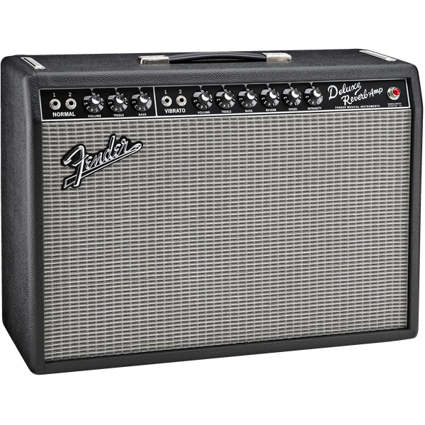The 22-watt '65 Deluxe Reverb® amp is for rock, country or blues players who want a moderately powered amp they can crank up at the gig or in the studio. The full, snappy guitar tones heard on many famous recordings from Memphis to Abbey Road were made using the Deluxe™ amp. Features include dual 6V6 Groove Tubes® output tubes, one 5AR4 rectifier tube, four 12AX7 preamp tubes, two 12AT7 tubes, one 12" 8-ohm Jensen® C-12K speaker, dual channels (normal and vibrato), tube-driven Fender® reverb, tube vibrato, two-button footswitch for reverb and vibrato on-off, black textured vinyl covering and silver grille cloth.