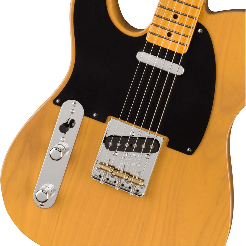The American Vintage II 1951 Telecaster features an ash body finished in Butterscotch Blonde to capture the tone and look of the original. The substantial ‘51 “U”-shaped hard rock maple neck plays like a dream with a 7.25” radius fingerboard and vintage tall frets. Characteristic of production in 1951, 12th fret face-dot spacing is narrow and the sole Phillips-head fastener on the guitar is at the truss rod nut. The triple brass saddle bridge, single-line “Fender Deluxe” tuners and Pure Vintage ‘51 Telecaster pickups deliver classic twang and authentic Fender style.