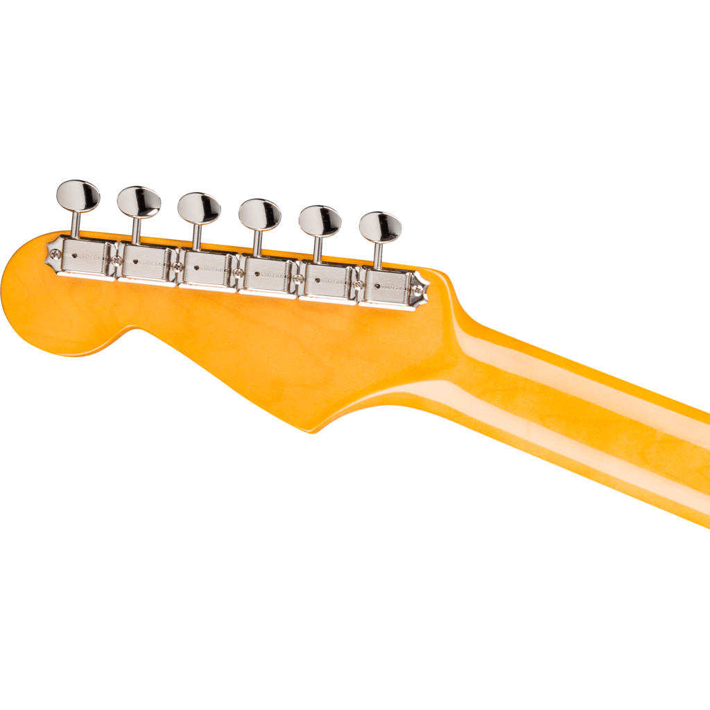 Relive the sound and spirit of 1965 with the American Vintage II 1965 Stratocaster. Smack in the middle of one of music’s most electrifying decades, the Stratocaster in 1965 was an instrument on its way to becoming rock’s greatest electric guitar. A perfect example of a Strat in a transition year, the 1965 Stratocaster® features a 1965 “C”-shaped maple neck, this time with a round-laminated rosewood fingerboard and larger pearl dot inlays. Other authentic features include an 11-hole three-ply white pickguard, the incredibly cool transition logo with larger lettering, and a set of amazing “gray bottom” Pure Vintage 1965 pickups.
