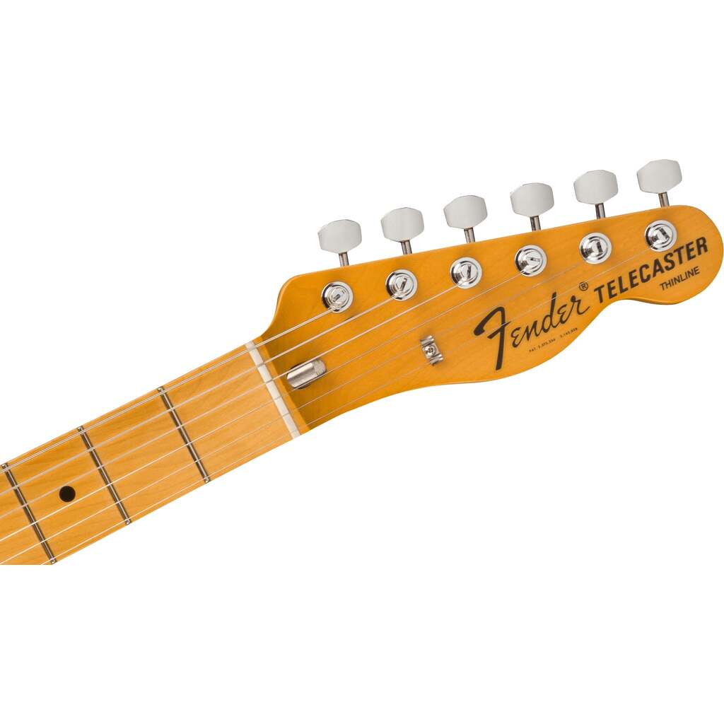 Featuring a “C”-shape hard rock maple neck, the American Vintage II 1972 Telecaster® Thinline plays like a dream with a 7.25” radius fingerboard and vintage tall frets. To create authentic Wide-Range humbucking pickups, we resurrected CuNiFe magnets, an essential element in recreating the sonics of the originals. Characteristic of production in 1972, this Thinline is outfitted with a convenient "Bullet" style truss rod nut, three-bolt neck plate with Micro-Tilt™ mechanism, “F” stamped tuners, 6-saddle string-through body hardtail with bent steel saddles and offered in Aged Natural, 3-Color Sunburst, and Lake Placid Blue over a semi-hollow ash body.
