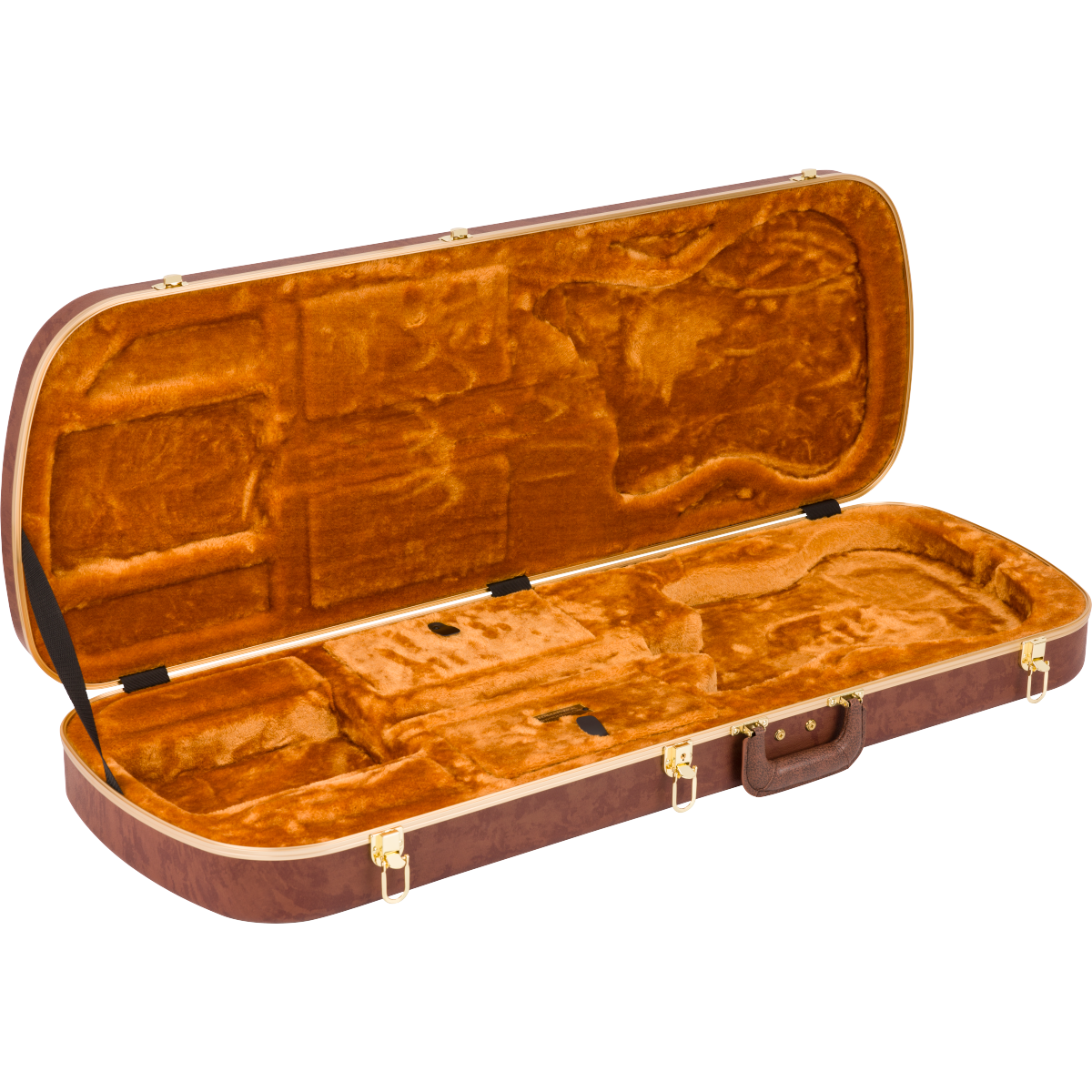 Travel back in time with this modern interpretation of Fender’s iconic eyeglass case. Modeled after the case that came with Jazzmaster® and Jaguar® guitars in the mid-1960’s, this case features modern appointments – constructed with a tough ABS outer shell and covered in a stunning textured faux cowhide print with gold hardware for vintage appeal. A soft crushed acrylic plush interior lining ensures your guitar remains scratch and damage-free while a double-door compartment provides ample space for accessories.