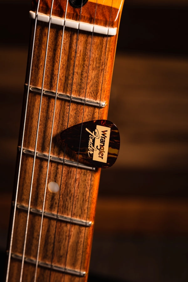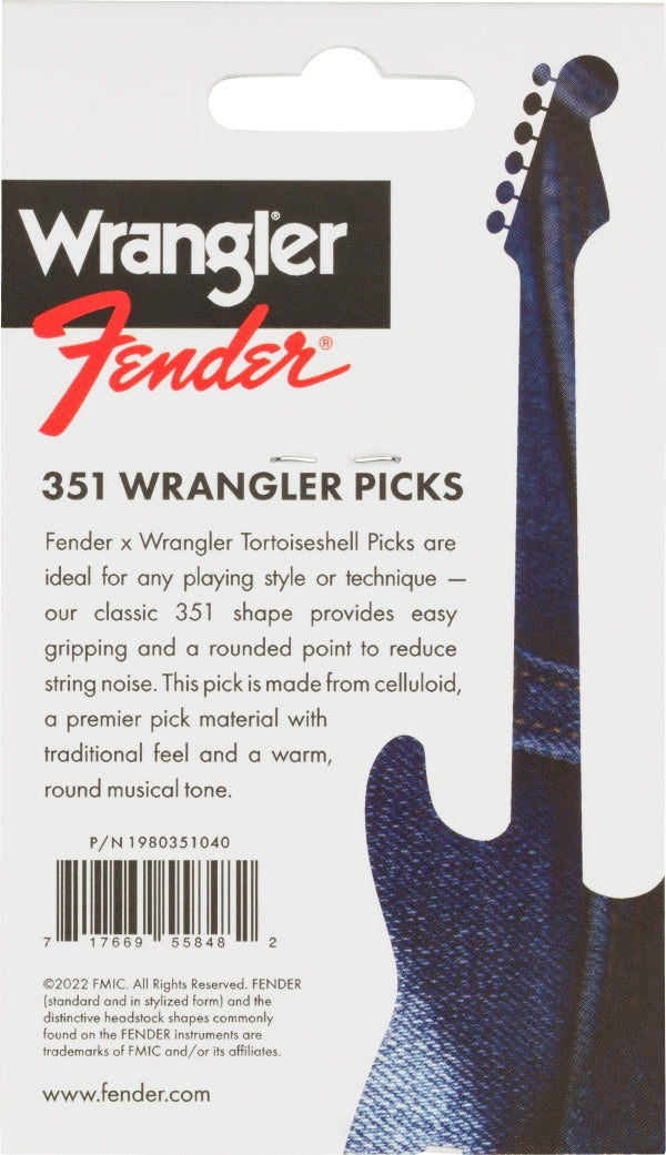 Fender® x Wrangler® Tortoiseshell Picks are ideal for any playing style or technique – our classic 351 shape provides easy gripping and a rounded point to reduce string noise. This pick is made from celluloid, a premier pick material with traditional feel and a warm, round musical tone. They also are a perfect fit for your Wrangler® x Fender® pick pocket on select jeans and jackets!