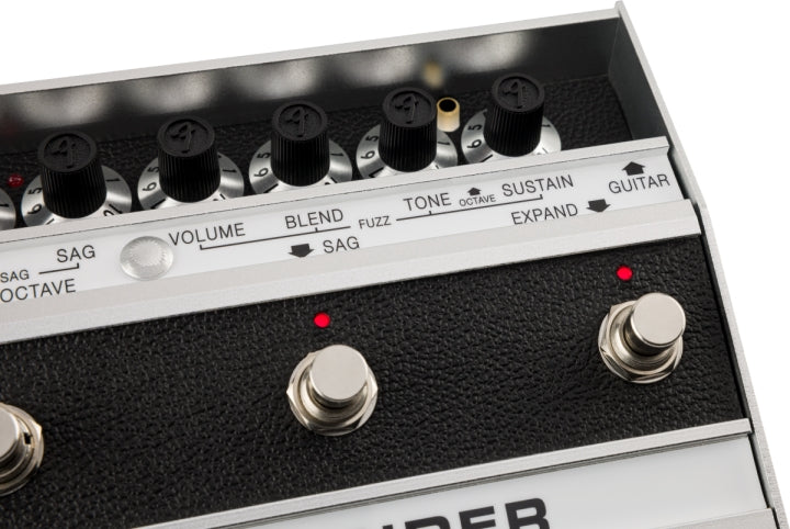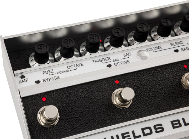 At its core, the Fender Shields Blender echoes the tone of Shields' own vintage 1970s Fender Blender, thanks to carefully hand tracing the circuit from his personal fuzz box. Built around this vintage circuit are entirely new ways of controlling and blending the original fuzz voice, all crafted with performance in mind utilizing four easy-access footswitches. Two footswitchable channels of fuzz, each with dedicated level controls, offer the ability to blend the fuzz voice with your clean signal or to blend the fuzz voice with a beefy suboctave fuzz, while the sag footswitch introduces sputtering and ducking effects like never before heard, all controlled by the intensity of your playing dynamics.