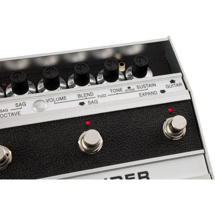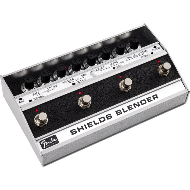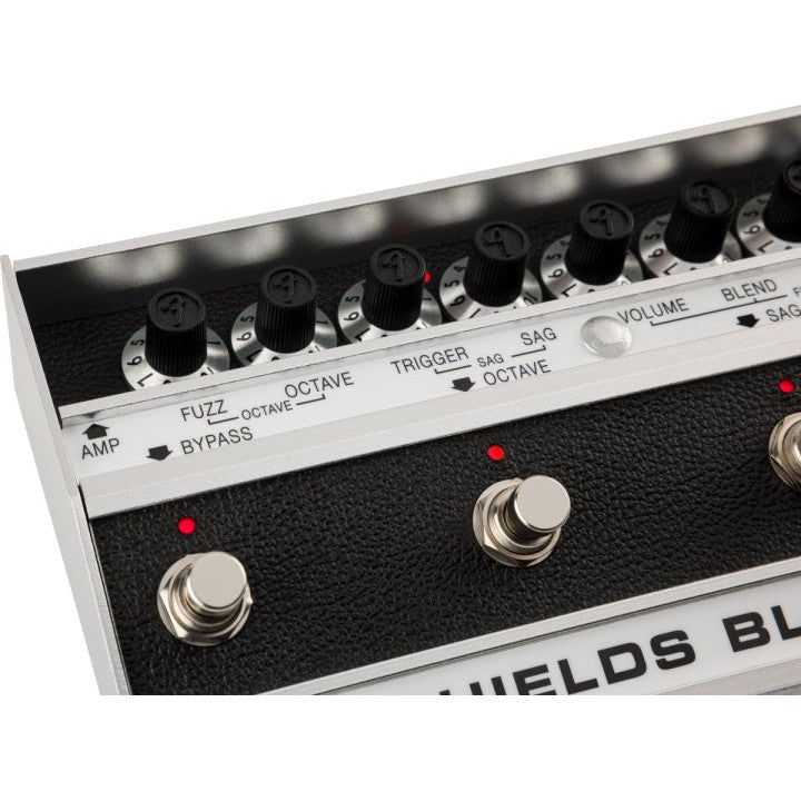 At its core, the Fender Shields Blender echoes the tone of Shields' own vintage 1970s Fender Blender, thanks to carefully hand tracing the circuit from his personal fuzz box. Built around this vintage circuit are entirely new ways of controlling and blending the original fuzz voice, all crafted with performance in mind utilizing four easy-access footswitches. Two footswitchable channels of fuzz, each with dedicated level controls, offer the ability to blend the fuzz voice with your clean signal or to blend the fuzz voice with a beefy suboctave fuzz, while the sag footswitch introduces sputtering and ducking effects like never before heard, all controlled by the intensity of your playing dynamics.