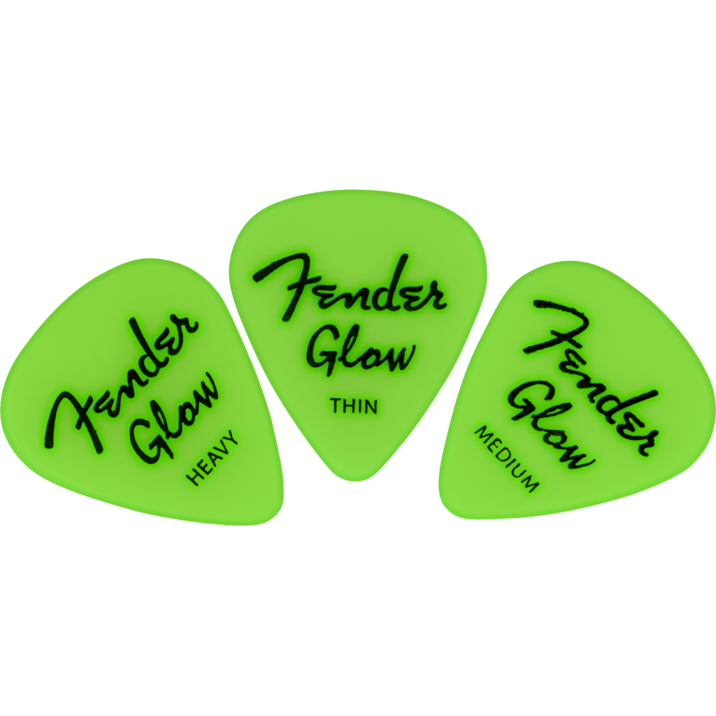 Strum in the dark with Fender glow in the dark picks. Made of our most popular material, cellulose acetate, the 351 shape is for players of versatile styles and techniques. Available in a 12 pack that includes 4 thin, 4 medium, and 4 heavy picks that offer multiple tonal and feel options.