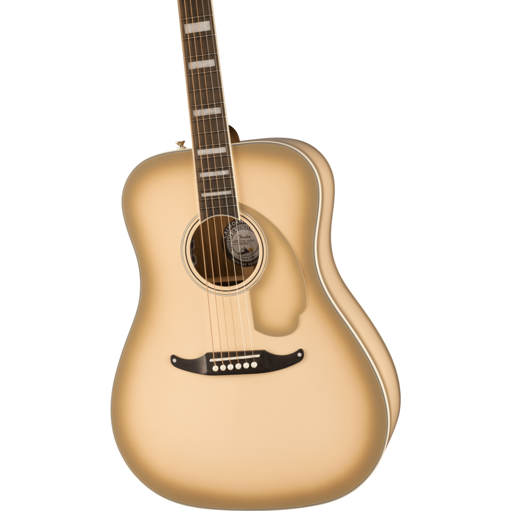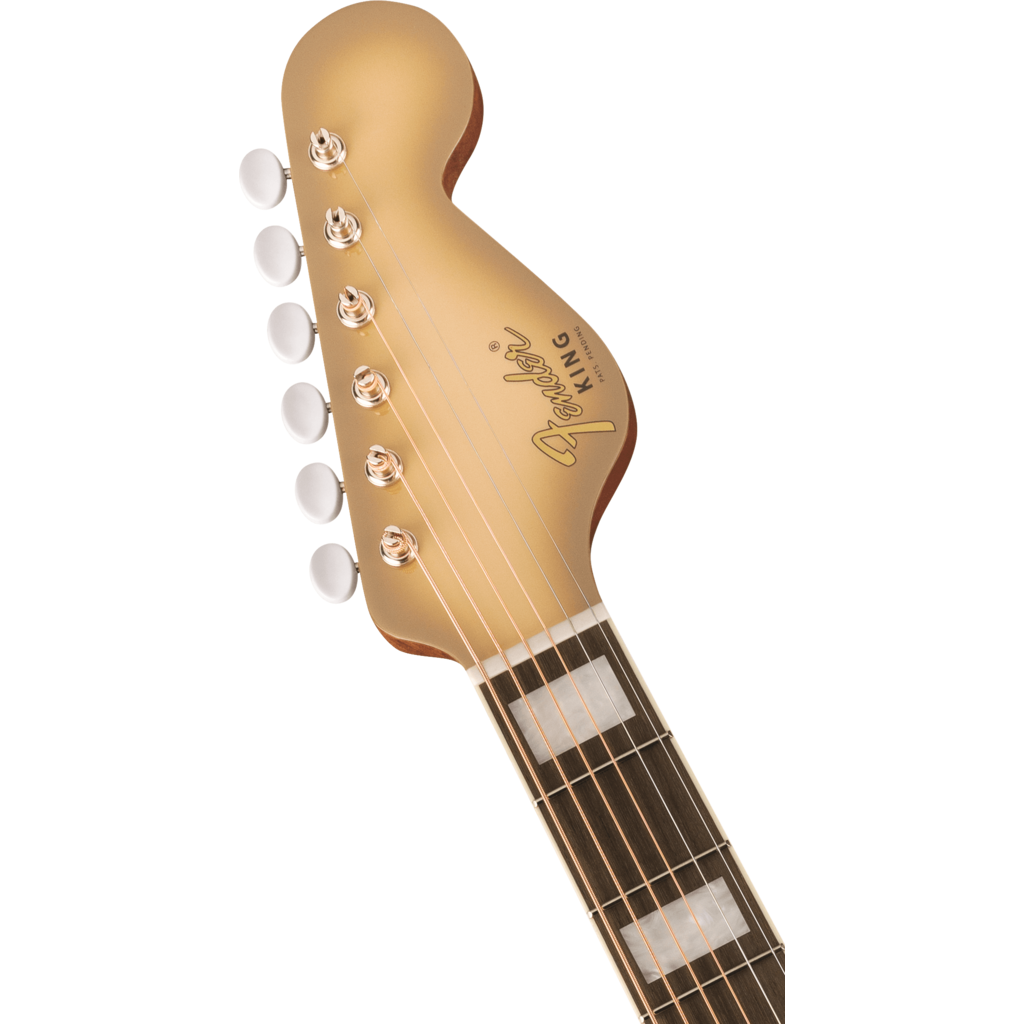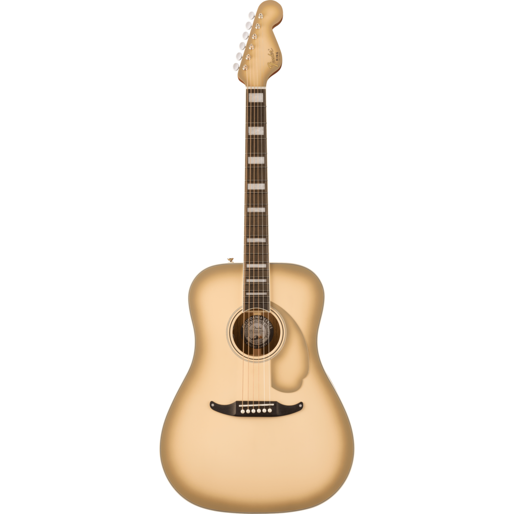 Engineered with an innovative Performance X™ bracing pattern, the dreadnought body of the Fender California Vintage King™ is lightly crafted with a solid Sitka spruce top and solid ovangkol back and sides to effortlessly produce a substantial, bass-filled voice with exceptional detail, projection and volume. An ergonomic modern "V" profile was chosen for the okoume neck along with a 25.5" scale length for optimal sustain, and a tilt-back 6-in-line headstock with a matching headcap for a distinctive look born from Fender's electric guitar DNA. Other notable details include a bound ovangkol fingerboard with pearloid block inlays for a throwback look, vintage-style tuning machines for smooth, accurate tuning, and a bone nut and saddle for superior harmonic character. Designed for the performer, the onboard Fishman® Presys VT Plus preamp system features seamless soundhole-mounted controls that blend an undersaddle piezo and internal body transducer to allow faithful and reliable reproduction of the guitar's natural sound when plugged into an amplifier or recording device. A vintage-style hardshell case is included.