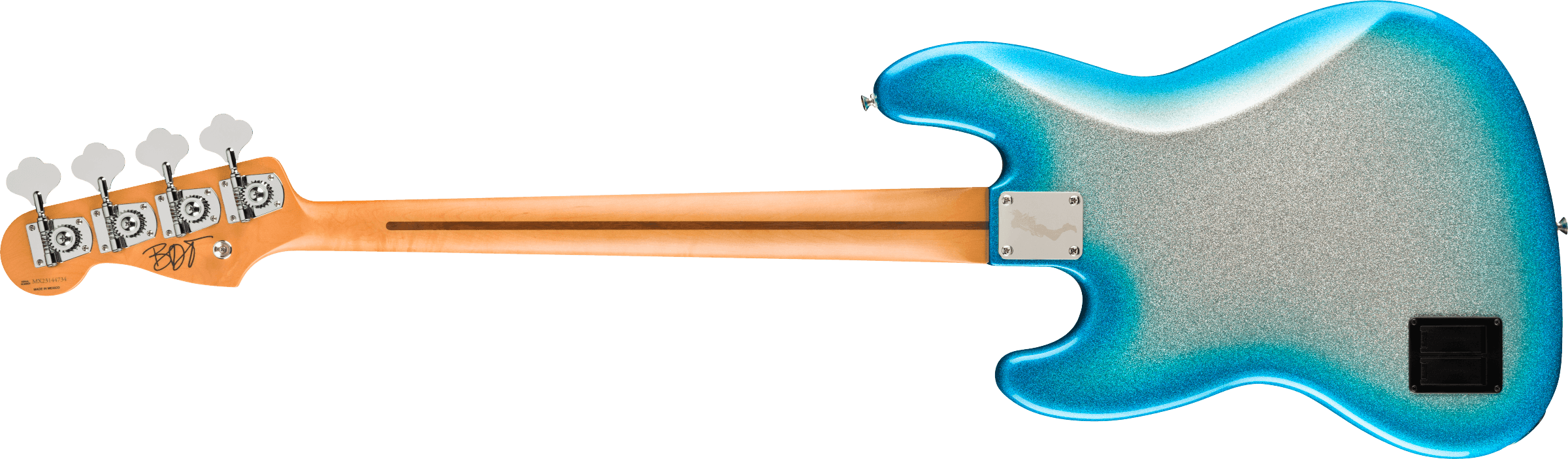 From the dazzling Sky Burst Sparkle to the gleaming chrome hardware and mirrored pickguard, every detail on this Jazz Bass echoes Blu's bold artistic vision. The offset ash body is chambered to keep this bass as lightweight and comfortable as possible. The satin finished maple neck, bound 9.5” rosewood fingerboard and vintage tall frets provide smooth playability. The Custom Blu DeTiger Fireball® bass humbucker and Player Plus Noiseless™ Jazz Bass Pickups fuse vintage charm with modern punch. The bass also includes an 18V Player Plus preamp with 3-band EQ and active/passive toggle, great for sculpting your tone and ideal for capturing the funky snap and growl that defines Blu's sound.