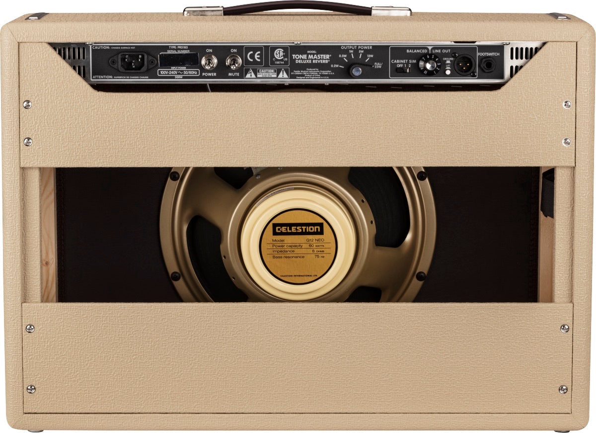 In a bold Fender first, the Tone Master Deluxe Reverb Blonde amplifier uses massive digital processing power to achieve a single remarkable sonic feat: faithfully modeling the circuitry and 22-watt power output of an original Deluxe tube amp. A high-performance 100-watt digital power amp is used to achieve the headroom and dynamic range of a real vintage Deluxe tube amp. The resonant pine cabinet is paired with a single Celestion® NEO Creamback speaker for a more distinctive rock 'n' roll flavor. The result is tubeless Deluxe Reverb tone, volume and dynamics virtually indistinguishable from the all-tube original. The amp model has been modified to remove the virtual bright cap on the Vibrato channel, which gives modern players greater tonal flexibility when using distortion and overdrive pedals. Additionally, the reverb control now provides easier fine tuning at lower settings. Perhaps most notably, even with all these features and more, the Tone Master Deluxe Reverb is in fact about only half the weight of an all-tube Deluxe. The blonde vinyl covering elegantly evokes classic early-’60s Fender vibe, and front panel features give guitarists a playing experience identical to the tube version, including Fender’s world-standard reverb and tremolo effects. Additional rear-panel features deliver modern convenience and flexibility—including an output power selector for full power and five attenuated settings, balanced XLR line output with impulse response (IR) cabinet simulations captured with Shure SM57 and Sennheiser MD421 microphones, mute switch for silent stage or recording use, USB port for firmware upgrades, and more. Output Power / Output: 22 Watts (simulated) Controls: Normal Channel: Volume, Treble, Bass. Vibrato Channel: Volume, Treble, Bass, Reverb. Vibrato: Speed, Intensity Effects: Reverb, Tremolo Amp Type: Digital Speakers: One - 12” Celestion® Neo Creamback Unique Features: Rear-panel output power selector for full power and five attenuated settings, Balanced XLR line output with impulse response (IR) cabinet simulations, level control, and ground switch, Lightweight, resonant pine cabinet, Power jewel illuminates in different colors for normal operation, warmup, and mute/silent mode, USB port for firmware upgrades, Universal worldwide 100V – 240V operation, Cover and two-button footswitch included.