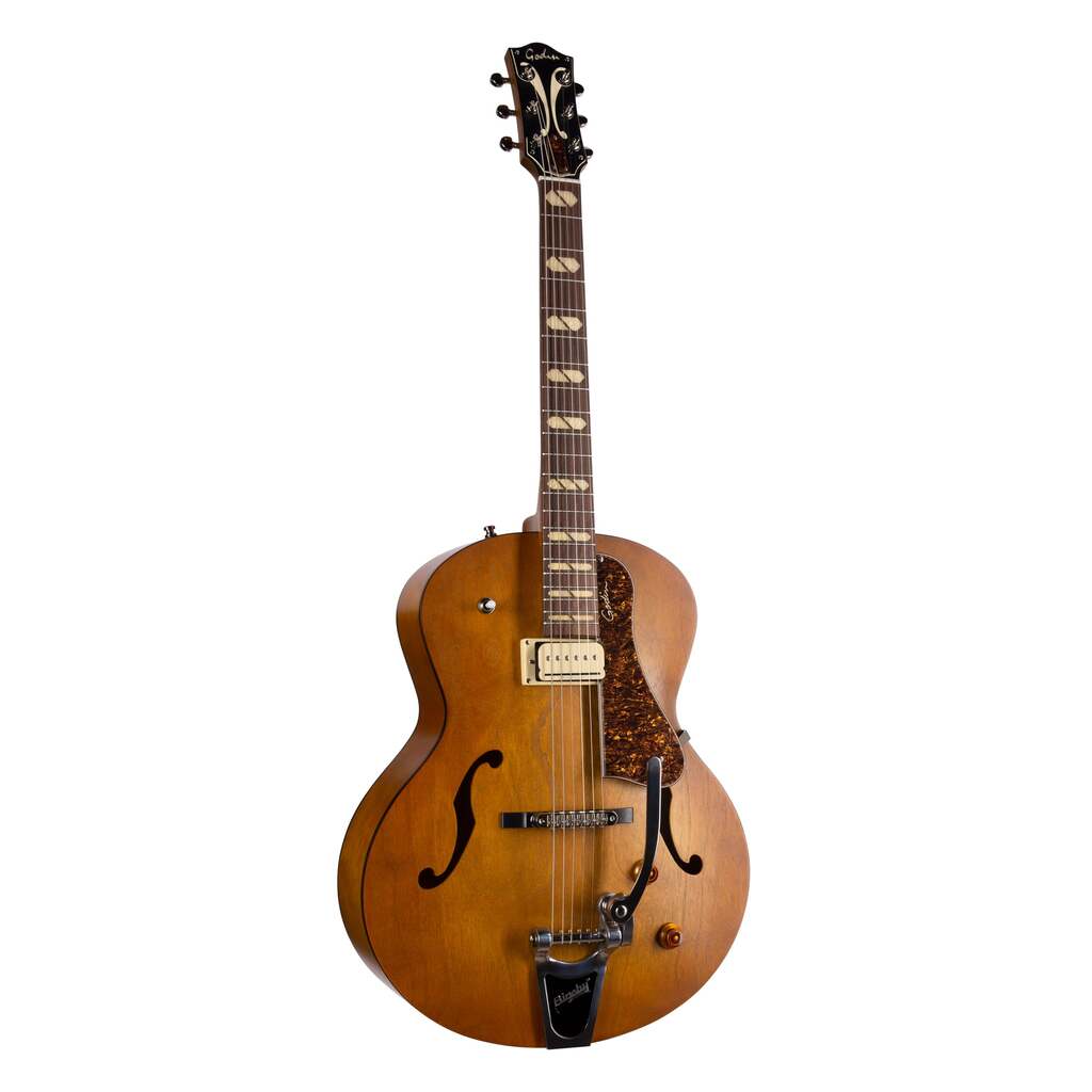 The Jumbo body provides plenty of projection, with its Canadian Wild Cherry archtop top, back and sides, and rustic-inspired custom polished finish. Other features include a Rosewood fingerboard, Silver Leaf Maple Neck, Graphtech Adjustable TUSQ Bridge base with T.O.M. Roller Saddles, a Bigsby Tremolo Tailpiece, and a custom-engraved headstock plate. The 24.84” scale neck offers an exceptionally comfortable feel to this guitar - delivering rich sound and great looks.