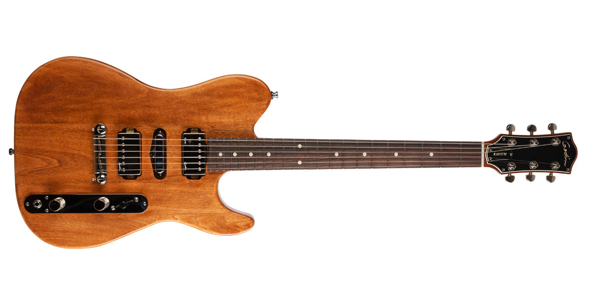 Presenting a new breed of single-cut guitars, which combines all the best elements of the Radiator and the Stadium into one: The Radium! It offers some unique features compared to the more traditional single cutaway solid-bodies, such as a short-scale (24 ¾”) set-neck and a 3&3 headstock design for comfortable playing and bending. The Radium also comes equipped with a H-S-H pickup configuration for a multitude of tonal possibilities, and a re-invented vintage-style control plate, which has a Volume, Push-Pull tone, and an angled Super 5-way switch that follows the natural sweep of your right hand for easy pickup selection. The guitar is voiced with Custom Godin Nickel-Covered Humbuckers for vintage tones, with the addition of a Godin Custom Cajun Nickel Single Coil in the middle. The Winchester Brown model has an eye-catching finish, worthy of a classic/aged vintage guitar. The Radium Winchester Brown…taking it up a notch! Specs Body:Mahogany centre with Canadian Laurentian Basswood wing Neck:Mahogany Set-Neck Fingerboard:Rosewood Fingerboard Radius:12" (304.8 mm) Scale Length:24.75" (628.65 mm) Nut Width:1.6875" (42.8625 mm) Nut Type:Graphtech Frets:22 Machine Head Ratio:Bass side 18:1, Treble side 26:1 Neck Pickup:Custom Godin humbucke:Middle Pickup Custom Cajun Nickel Bridge Pickup:Godin Custom Humbucker Bridge and Tailpiece:Waparound bridge Controls:Super 5-way Switch, 1x Push-Pull Tone, 1x Volume Color:Winchester Brown H.D.R:Not Included Finish:Semi Gloss String Set:E10 String Guages:.010 .013 .017 .026 .036 .046 Case:Gig Bag