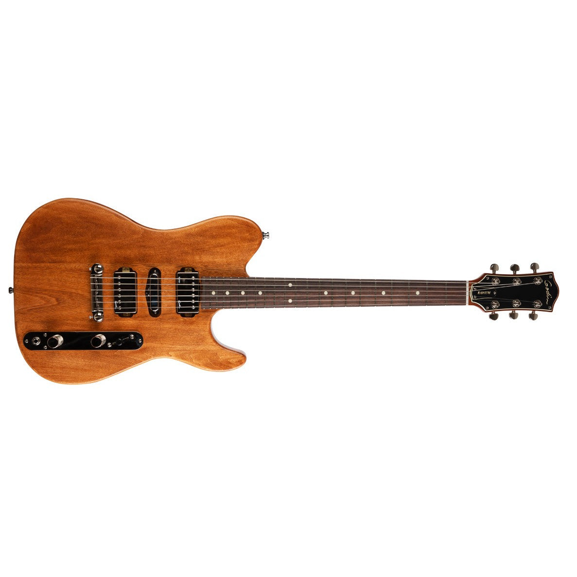 Presenting a new breed of single-cut guitars, which combines all the best elements of the Radiator and the Stadium into one: The Radium! It offers some unique features compared to the more traditional single cutaway solid-bodies, such as a short-scale (24 ¾”) set-neck and a 3&3 headstock design for comfortable playing and bending. The Radium also comes equipped with a H-S-H pickup configuration for a multitude of tonal possibilities, and a re-invented vintage-style control plate, which has a Volume, Push-Pull tone, and an angled Super 5-way switch that follows the natural sweep of your right hand for easy pickup selection. The guitar is voiced with Custom Godin Nickel-Covered Humbuckers for vintage tones, with the addition of a Godin Custom Cajun Nickel Single Coil in the middle. The Winchester Brown model has an eye-catching finish, worthy of a classic/aged vintage guitar. The Radium Winchester Brown…taking it up a notch! Specs Body:Mahogany centre with Canadian Laurentian Basswood wing Neck:Mahogany Set-Neck Fingerboard:Rosewood Fingerboard Radius:12" (304.8 mm) Scale Length:24.75" (628.65 mm) Nut Width:1.6875" (42.8625 mm) Nut Type:Graphtech Frets:22 Machine Head Ratio:Bass side 18:1, Treble side 26:1 Neck Pickup:Custom Godin humbucke:Middle Pickup Custom Cajun Nickel Bridge Pickup:Godin Custom Humbucker Bridge and Tailpiece:Waparound bridge Controls:Super 5-way Switch, 1x Push-Pull Tone, 1x Volume Color:Winchester Brown H.D.R:Not Included Finish:Semi Gloss String Set:E10 String Guages:.010 .013 .017 .026 .036 .046 Case:Gig Bag