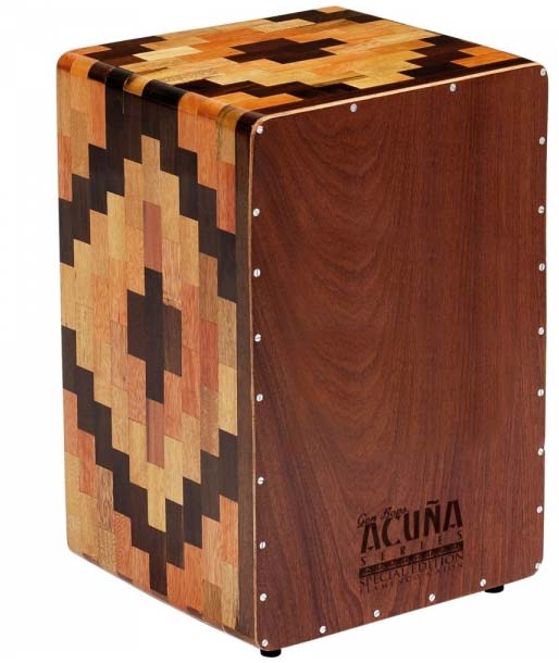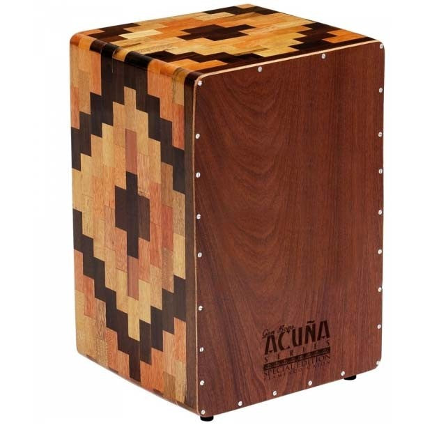 Truly a work of art! This beautifully and painstakingly hand-inlayed instrument is also one of the most versatile Cajons on the market. Its deep, resonant bass tone is awe-inspiring. Playing with hands closer to the edges results in multiple levels of "snap" as the minimalist guitar string wires are engaged, resulting in some truly sublime effects. Wires are configured diagonally across the corners for reduced snare sound when playing bass tones. An increased number of adjustable screws also results in greater control over snap and resonance. The seamless finish features Peruvian hardwood dovetailed corners with smoothly rounded joints. And individual multi-coloured wood tiles are arranged into a spectacular wooden mosaic. Hand-crafted and meticulously tested in Peru by our skilled craftsmen!