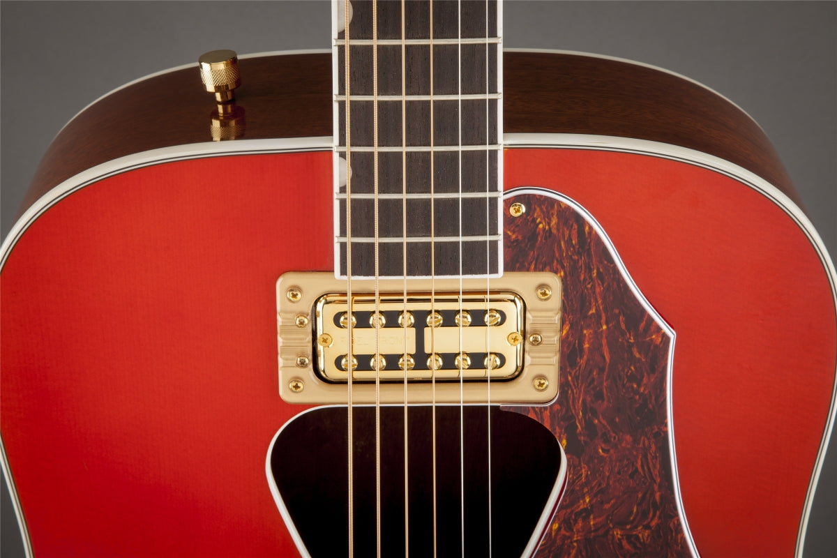 The G5034TFT Rancher dreadnought is one of the most distinctive Rancher models ever, with a sweet iso-chamber mounted Fideli'Tron™ pickup for great amplified tone and performance and a Bigsby® B70G tailpiece with a "wire" trem arm.