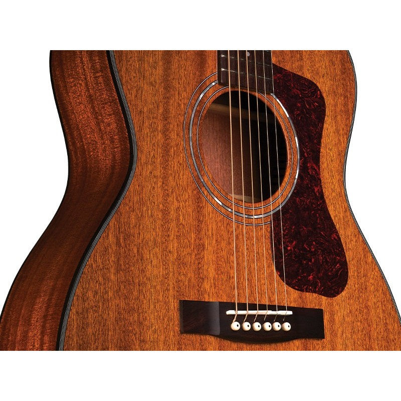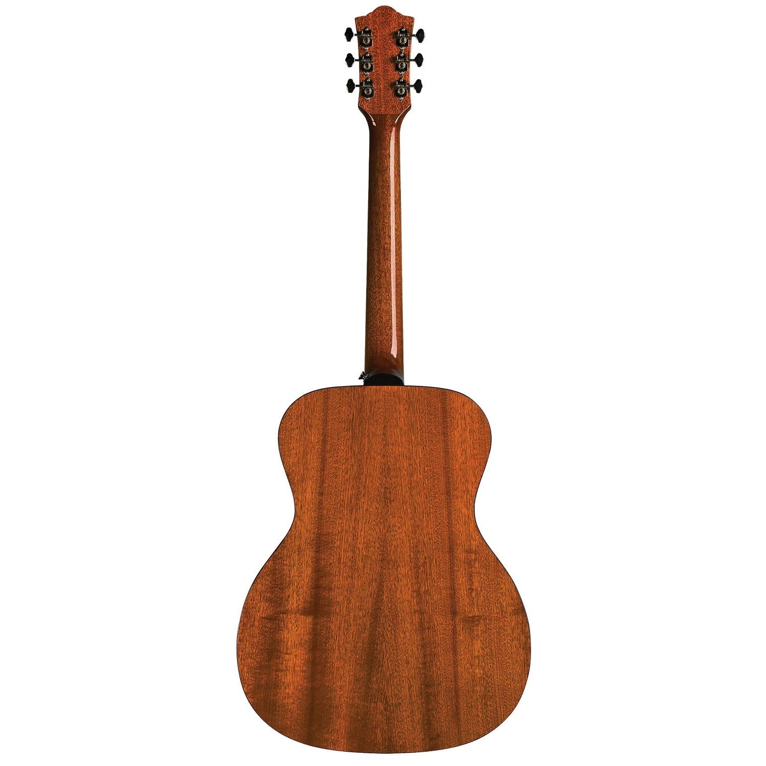 This mid-sized orchestra shaped acoustic is equally suited for strumming and fingerpicking, and produces a sweet, balanced tone. The perfect choice for the versatile musician, the OM-120 features a solid African mahogany top and solid African mahogany back and sides. Other premium features include a bone nut and saddle and mother-of-pearl rosette. This model also has a 1¾” nut width on a vintage shaped Guild neck, iconic Chesterfield headstock emblem reminiscent of 1960s Guilds, period-correct tortoiseshell pickguard, and Guild’s new premium acoustic gig bag.