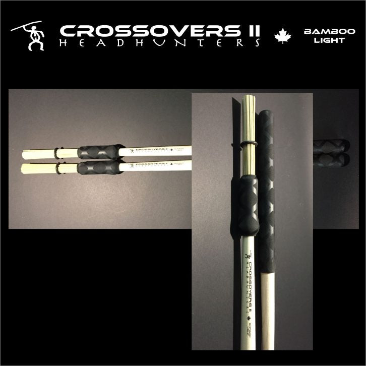The Crossovers II Bamboo Light combine the concept of bundled rods with that of a regular maple drum stick. After lathing the unique shaped shaft of the Crossover II, we drill a centre hole down to a bulb area then insert and secure bundle of light weight bamboo strands. The bamboo strands are very thin, allowing for many to be inserted into the playing end. They provide a soft natural sound. Because we leave the outer skin intact on these thin bamboo strands, there are very strong and resilient. We then finish the stick with our user friendly ‘Grip Control’ which features our double textured ‘X’ pattern feel. The overall playing benefits, of the solid wood zone for bell and cymbal definition, cross sticking and rim shot friendly are all part characteristic inherent in all the Crossovers unique Hybrid Bundle design.