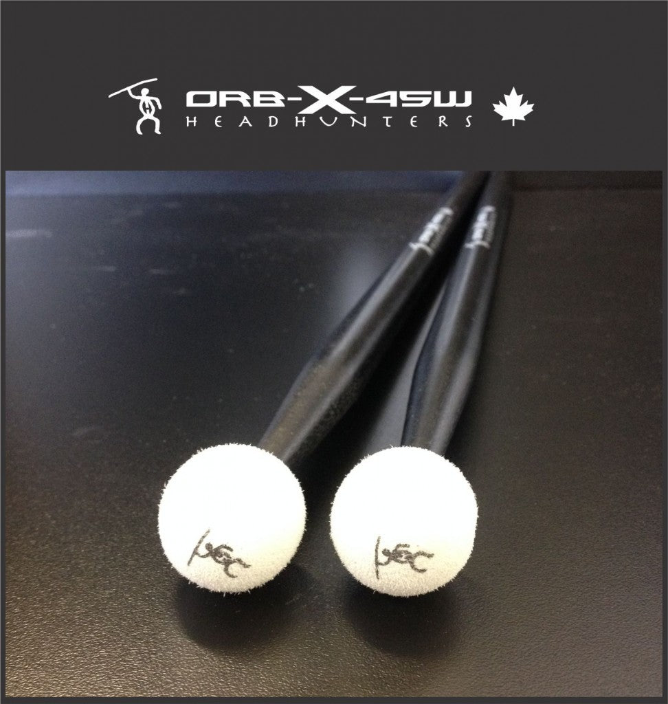 The Orb-X45W has a 45 milimeter white mallet head on a black maple drum stick