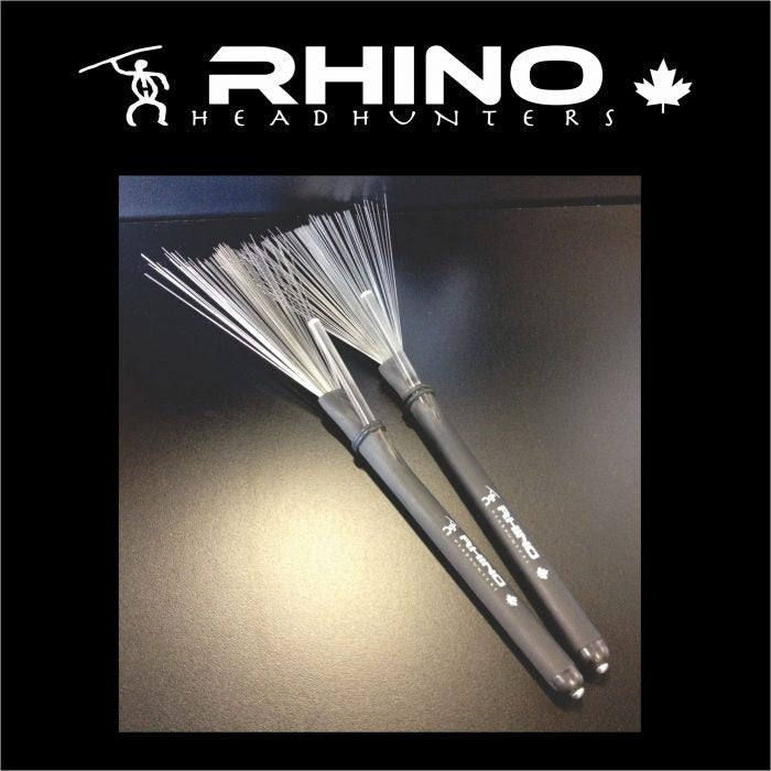 Rhino incorporate an adjustable polycarbonate rod and a traditional non retractable wire brush. The rod used in the Rhino is heavier and stiffer than that of the Cyclops and there is no bead. When rod is engaged in or impacted in rims or cymbals the sound it very distinct. The larger rod has incredible reflex and therefore its rebound is extremely fast.