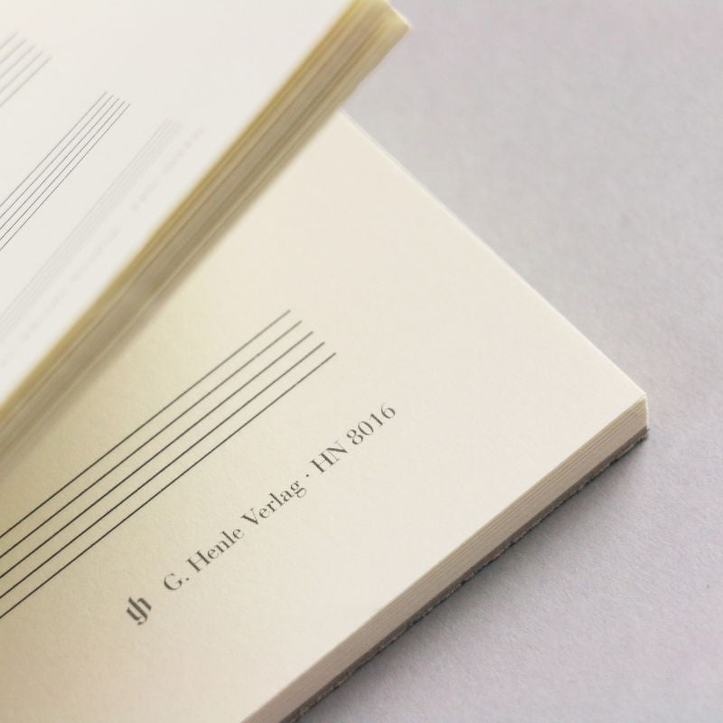Music manuscript notepad with original Henle blue cover and music paper, 100 pages with 12 staves per page, paper with four holes, A4, with a strong cardboard backing.
