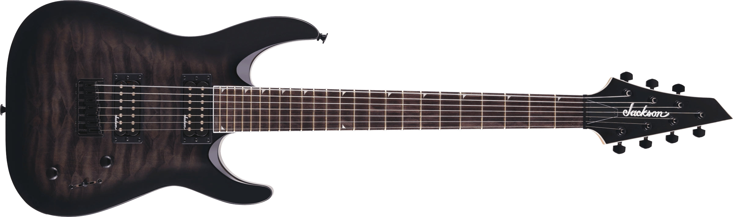 A formidable 7-string beast, the JS Series Dinky Arch Top JS22Q-7 DKA HT is wrapped in a brooding Transparent Black Burst finish with all-black hardware and our Jackson 3x4 AT-1 black headstock.
