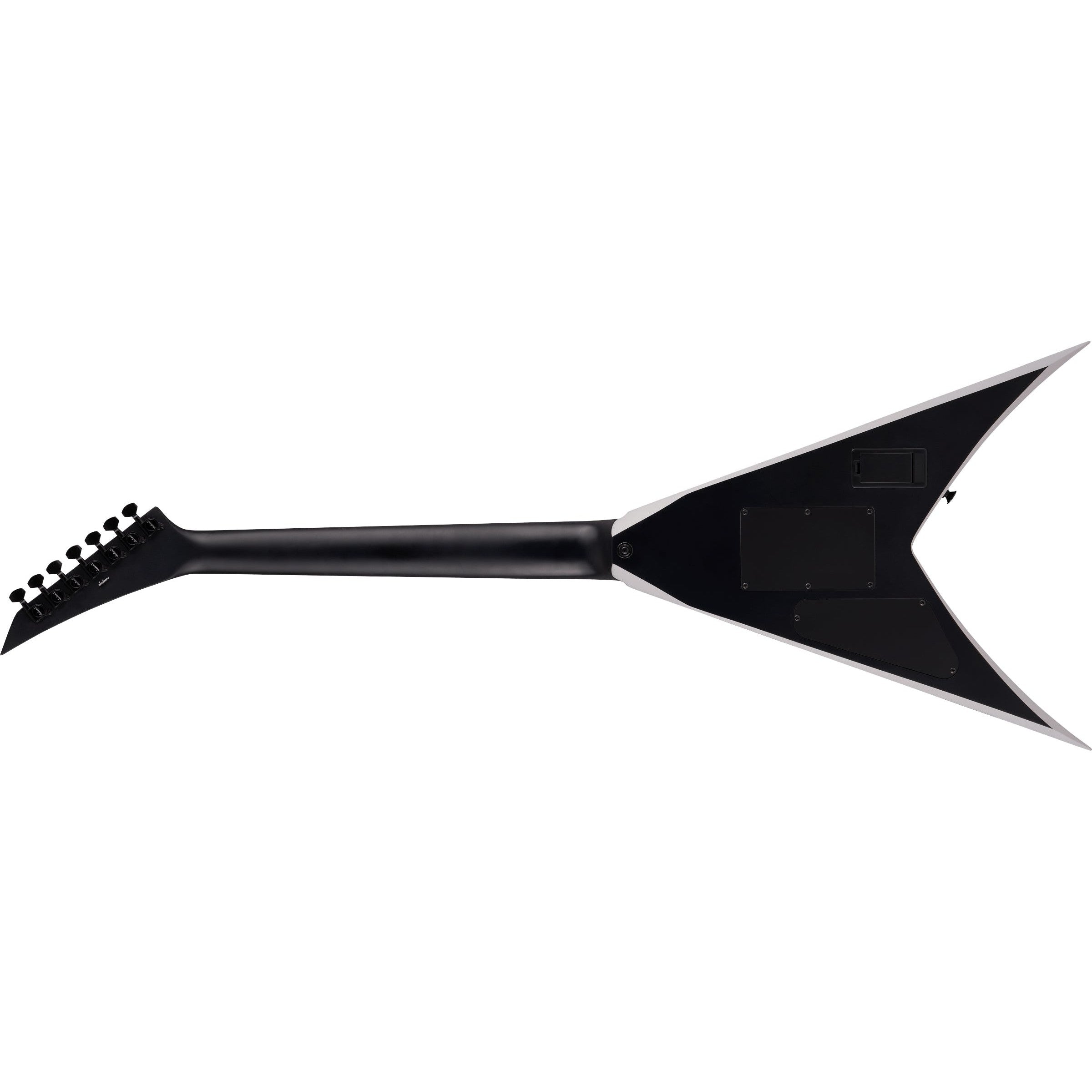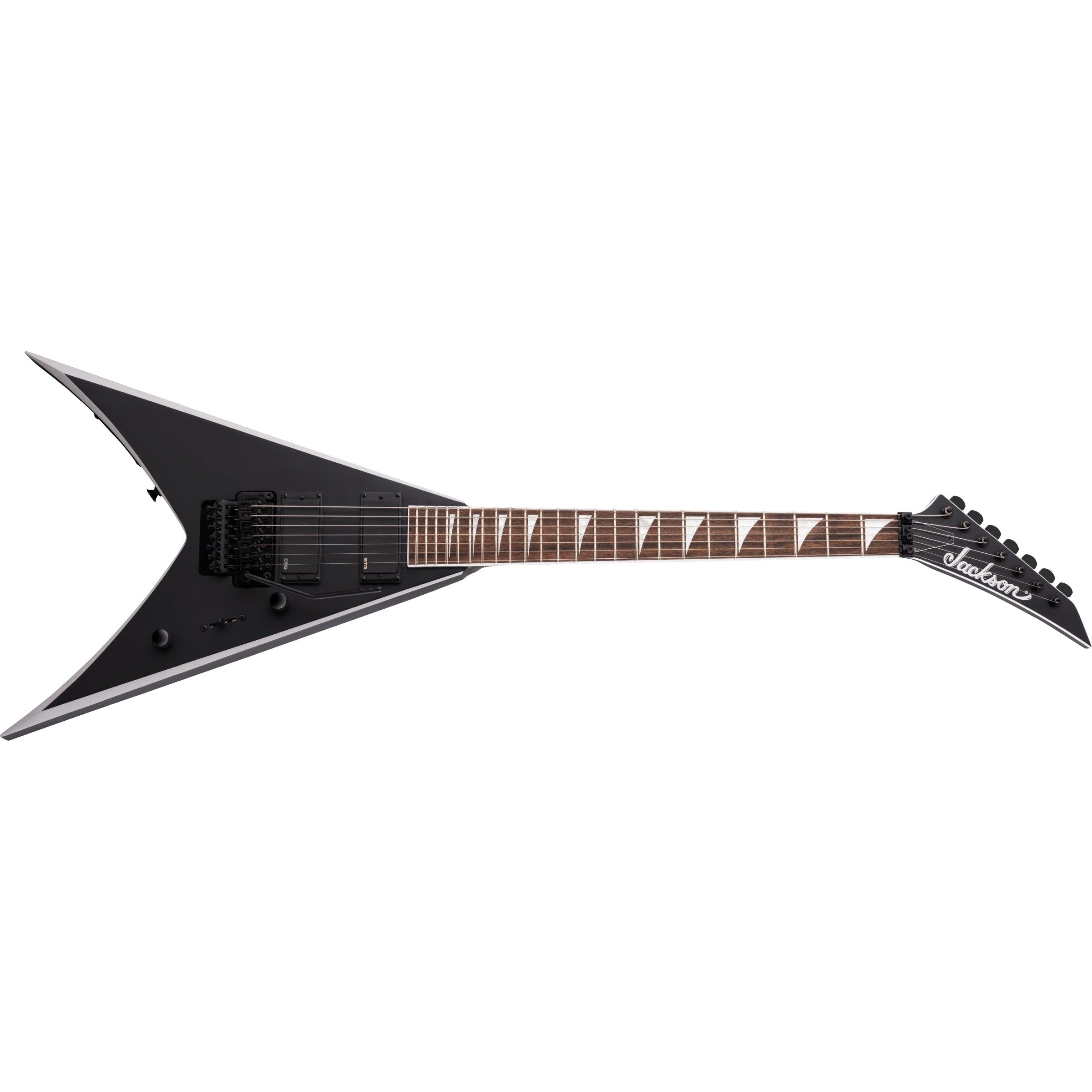 The Jackson® X Series King V™ KVX-MG7 has a poplar body, 26.5” scale length and through-body maple neck with graphite reinforcement to guard against climate-induced warping and scarf joint for reduced playing fatigue. Hosting 24 jumbo frets, the 12"-16" compound radius bound laurel fingerboard curves more dramatically at the nut for easy chording and flattens out as it approaches the neck joint for low-action bends without fretting out.