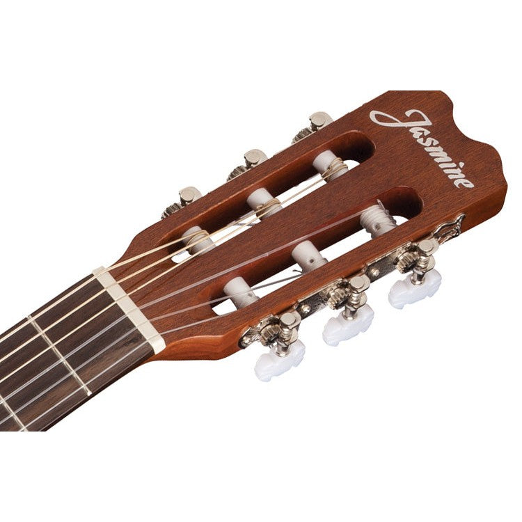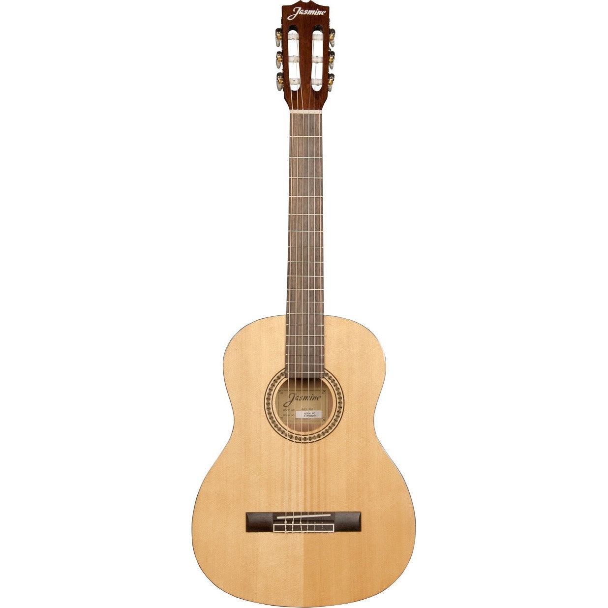 The Jasmine JC-23 is a 3/4 size classical guitar that offers great nylon string sound in a package that’s just the right size. Great for developing players or anyone looking for a great sounding, easy playing guitar, the JC-23 features a select spruce top with Jasmine’s Advanced Classical Bracing, and sapele back and sides for superior tone. The slim satin finished neck and short 23 3/8″ scale length provide smooth, comfortable feel and excellent playability that will have you playing for hours. Other great features include a rosewood fingerboard and bridge, a beautiful mosaic rosette and a gloss finished top.