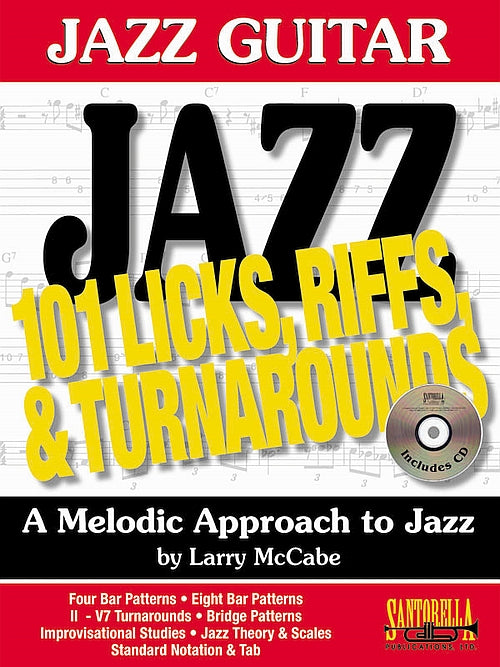 101 Jazz Guitar Licks, Riffs & Turnarounds published by Santorella Publications is a book and CD set which teaches exactly 101 phrases played over standard jazz chord progressions in several different keys. If you currently play blues, country, folk, classical or rock, and desire to venture into jazz, this book is exactly what you need to help expand your horizons. Every Lick, Riff & Turnaround is written in standard notation & tablature including chord symbols and suggested fingerings by Larry McCabe. Each pattern is played over a “real” chord progression, so it will be easy to relate the examples in “real” music. In addition, you will experience noticeable improvement in your knowledge of the fingerboard, technical facility, harmonic vocabulary and ability to conceive and express modern musical ideas. The CD is recorded in stereo with the lead heard mainly on the right channel and the bass guitar is heard on the left. Rhythm guitar, bass and drums accompany the lead guitar. Switching the stereo balance from the right to the left channel allows you to isolate the entire rhythm section or lead guitar solo. We are certain that this Santorella collection of “dazzling jazz riffs” will bring you much musical growth and personal satisfaction. 101 Musical examples are broken into the following categories; Major Patterns (C) - Dorian Patterns (Dm7) - Mixolydian Patterns (G7) - ii-V7-I Patterns (Dm7-G7-C) - Modified ii-V7-I Patterns - Four-Bar Patterns - Eight-Bar Patterns - Bridge Patterns - Turnarounds - Appendixes; Basic Theory for the Jazz Musician - Major Scales - Dorian Scales - Mixolydian Scales.