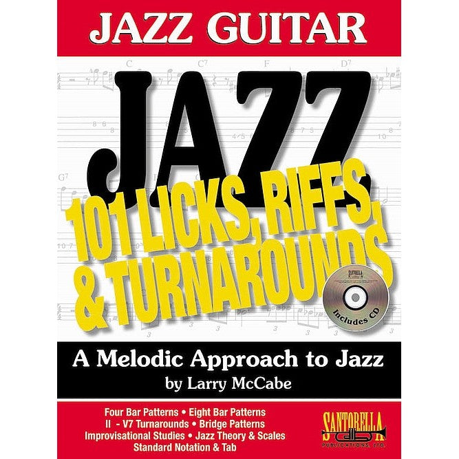 101 Jazz Guitar Licks, Riffs & Turnarounds published by Santorella Publications is a book and CD set which teaches exactly 101 phrases played over standard jazz chord progressions in several different keys. If you currently play blues, country, folk, classical or rock, and desire to venture into jazz, this book is exactly what you need to help expand your horizons. Every Lick, Riff & Turnaround is written in standard notation & tablature including chord symbols and suggested fingerings by Larry McCabe. Each pattern is played over a “real” chord progression, so it will be easy to relate the examples in “real” music. In addition, you will experience noticeable improvement in your knowledge of the fingerboard, technical facility, harmonic vocabulary and ability to conceive and express modern musical ideas. The CD is recorded in stereo with the lead heard mainly on the right channel and the bass guitar is heard on the left. Rhythm guitar, bass and drums accompany the lead guitar. Switching the stereo balance from the right to the left channel allows you to isolate the entire rhythm section or lead guitar solo. We are certain that this Santorella collection of “dazzling jazz riffs” will bring you much musical growth and personal satisfaction. 101 Musical examples are broken into the following categories; Major Patterns (C) - Dorian Patterns (Dm7) - Mixolydian Patterns (G7) - ii-V7-I Patterns (Dm7-G7-C) - Modified ii-V7-I Patterns - Four-Bar Patterns - Eight-Bar Patterns - Bridge Patterns - Turnarounds - Appendixes; Basic Theory for the Jazz Musician - Major Scales - Dorian Scales - Mixolydian Scales.