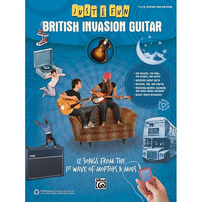 Just for Fun: British Invasion Guitar is designed for your total enjoyment. Each featured song is arranged from the original guitar parts, simplified just enough to keep it fun and easy, yet musically very satisfying. Standard notation, TAB, chords, lyrics, and a chord dictionary are included. Plus, ukulele, mandolin, and banjo books with matching arrangements are available---just for fun! Titles: 19th Nervous Breakdown (The Rolling Stones) * As Tears Go By (Marianne Faithfull) * Dedicated Follower of Fashion (The Kinks) * I Saw Her Standing There (The Beatles) * The Kids Are Alright (The Who) * Please Please Me (The Beatles) * (I Can't Get No) Satisfaction (The Rolling Stones) * Shapes of Things (The Yardbirds) * She's Not There (The Zombies) * Tell Her No (The Zombies) * When You Walk in the Room (The Searchers) * You've Got Your Troubles (The Fortunes).