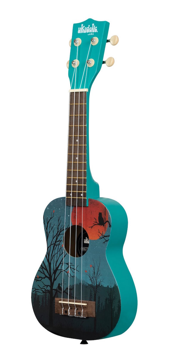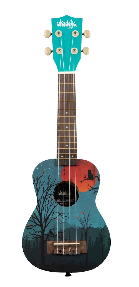 On a crisp winter night in the light of a blood red moon, the solitary owl perches on a branch, staring at the mountains that disappear into the distance. Bathed in the warm glow of the Moonrise, small orange birds rest in the bare branches of the trees below while a lone crow sits, unnoticed on the bottom branch. This original artwork was created by our in house artists and is complemented by Loch Ness green back and sides.