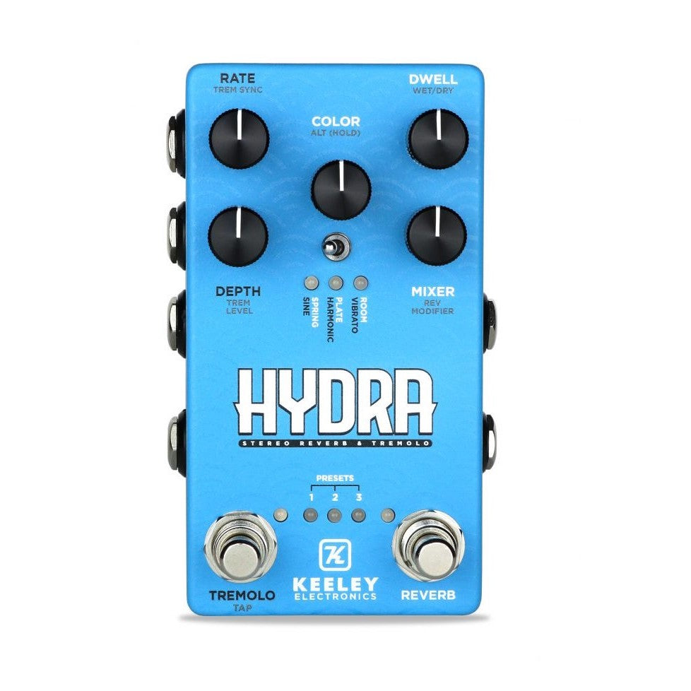 The HYDRA combines high-fidelity Reverb and Tremolo to add space and dimension to your guitar, bass, or keyboard signal. After the team at Keeley completed the ECCOS, we wanted to craft the perfect companion pedal, and we did just that with our new, feature-rich blue box.