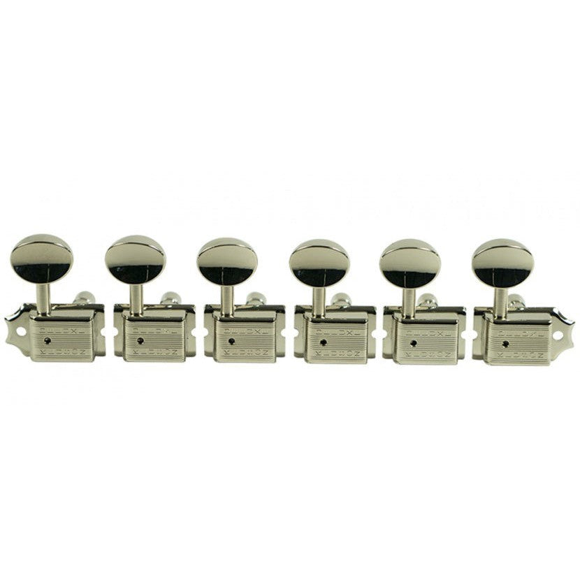 Plastic Button Tuners, 3 On Plate, Nickel (Type WD90NPP) Complete set includes both bass and treble side tuning machines on a plate. Includes bushings and mounting screws. Historically correct replacement for many Gibson®, Kay® and Epiphone® guitars.. Used on Les Paul Jr / SG Junior