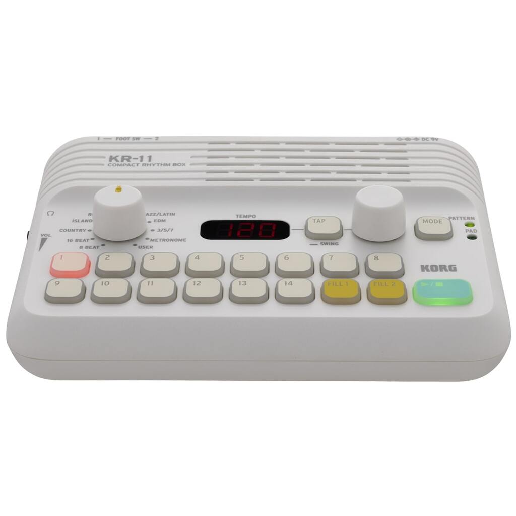Compact and simple, the Rhythm Box is a fun way to practice and play anywhere, anytime. The new KR-11 is a compact yet feature-packed rhythm machine, which offers a portable solution to bring variety and fun to your music practice. The KR-11 compact rhythm box brings the rhythm machine legacy into the modern era, pioneered by the legendary Korg Doncamatic in 1963. Easy-to-use rhythm playback and customization anytime, anywhere. Simply choose your favorite genre to get started! Each genre includes 14 variations for a total of 126 distinct patterns, as well as 14 dedicated slots where users can easily save their own unique patterns, taking your practice sessions to new levels of enjoyment. KR-11 is battery-powered, lightweight, and compact. The built-in speaker allows for easy on-the-spot playing of a wide variety of rhythmic phrases. In addition to fundamental patterns like 8-beat and 16-beat, the KR-11 features specific styles like ‘’'Blues/R&B,' and ‘'Country' tailored for guitarists and ‘Island' for ukulele. Beside three-beat patterns the KR-11 also features more intricate five- and seven-beat patterns. The swing function adds versatility to each pattern, expanding the range of variations. The KR-11 also includes a metronome function for fundamental practice, making it an essential tool for a broad spectrum of musicians, including guitarists, bassists, keyboardists, and orchestral players. Easy-to-use rhythm playback and customization anytime, anywhere. Simply choose your favorite genre to get started! Each genre includes 14 variations for a total of 126 distinct patterns, as well as 14 dedicated slots where users can easily save their own unique patterns, taking your practice sessions to new levels of enjoyment.