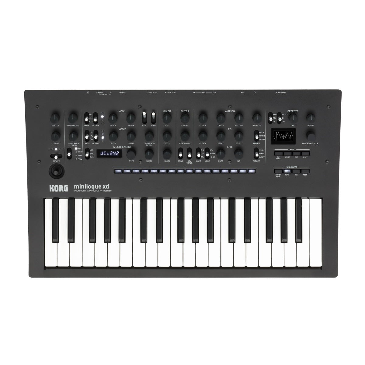 In addition to emphasizing the same real analog sound and joy of controlling an electronic musical instrument offered by the original minilogue, the minilogue xd newly adds a digital multi-engine, effects, a powered-up sequencer, and micro tuning functionality, further expanding the possibilities for sound design and performance potential.
