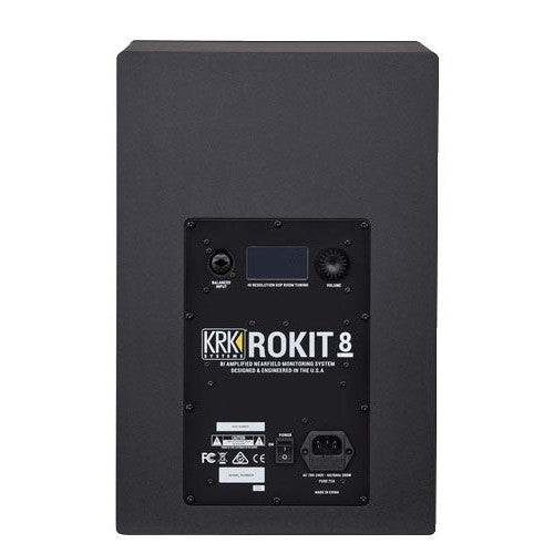 The new 8" KRK ROKIT RP8 G4 (Generation 4) bi-amp professional monitor takes music and sound creativity to a whole new industry-level.DSP-driven Graphic EQ with 25 settings help condition your acoustic environment while offering new levels of versatility in a studio monitor. Matching drivers made with Kevlar® ensures the same sonic integrity across all frequencies. A new scientifically designed speaker enclosure and front-firing port offer exceptional low-end extension and accuracy, punch and flexible room-positioning. The new powerful, yet efficient custom Class D power amplifier drives the speakers evenly and more efficiently at reduced operating temperatures and improves audio integrity.