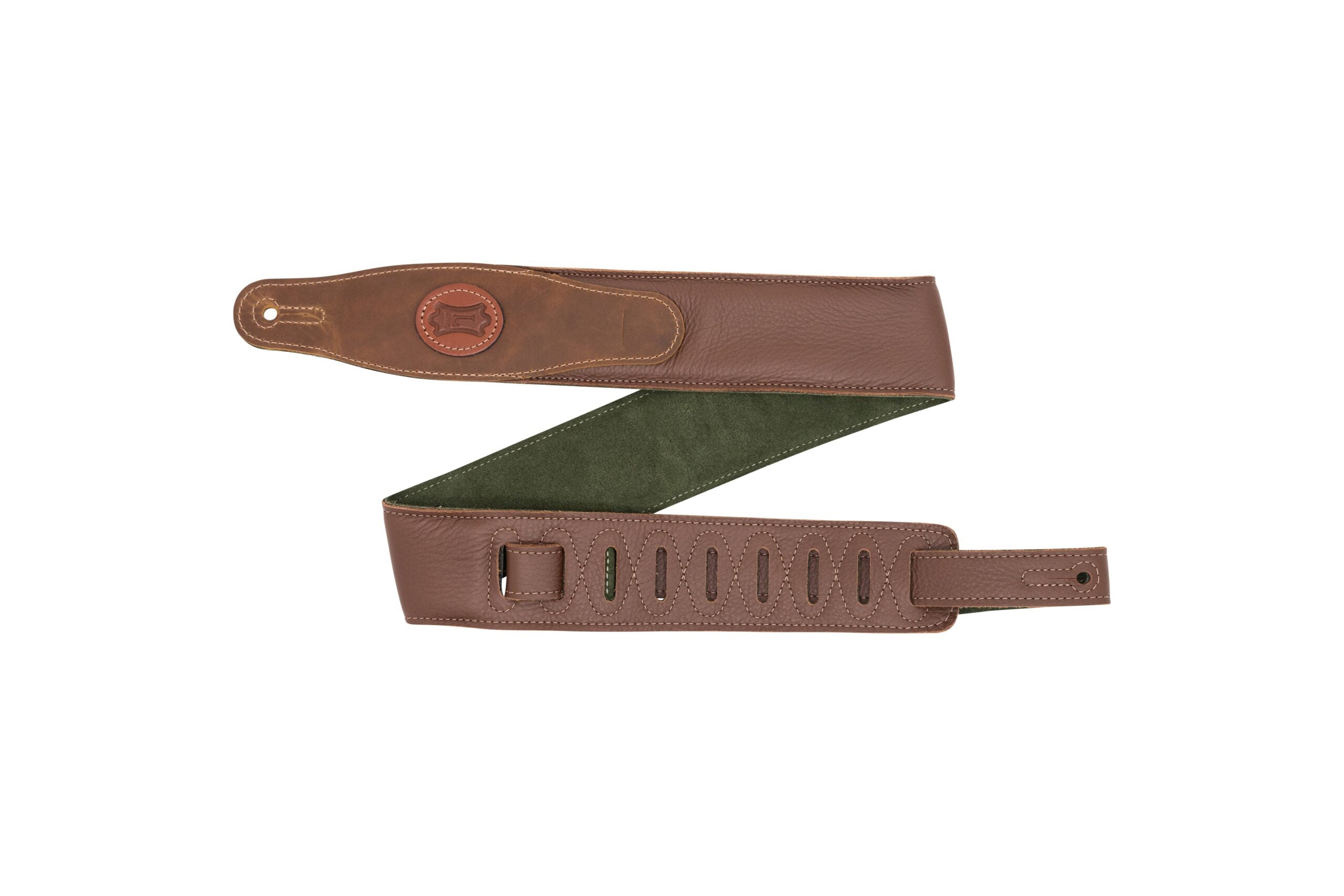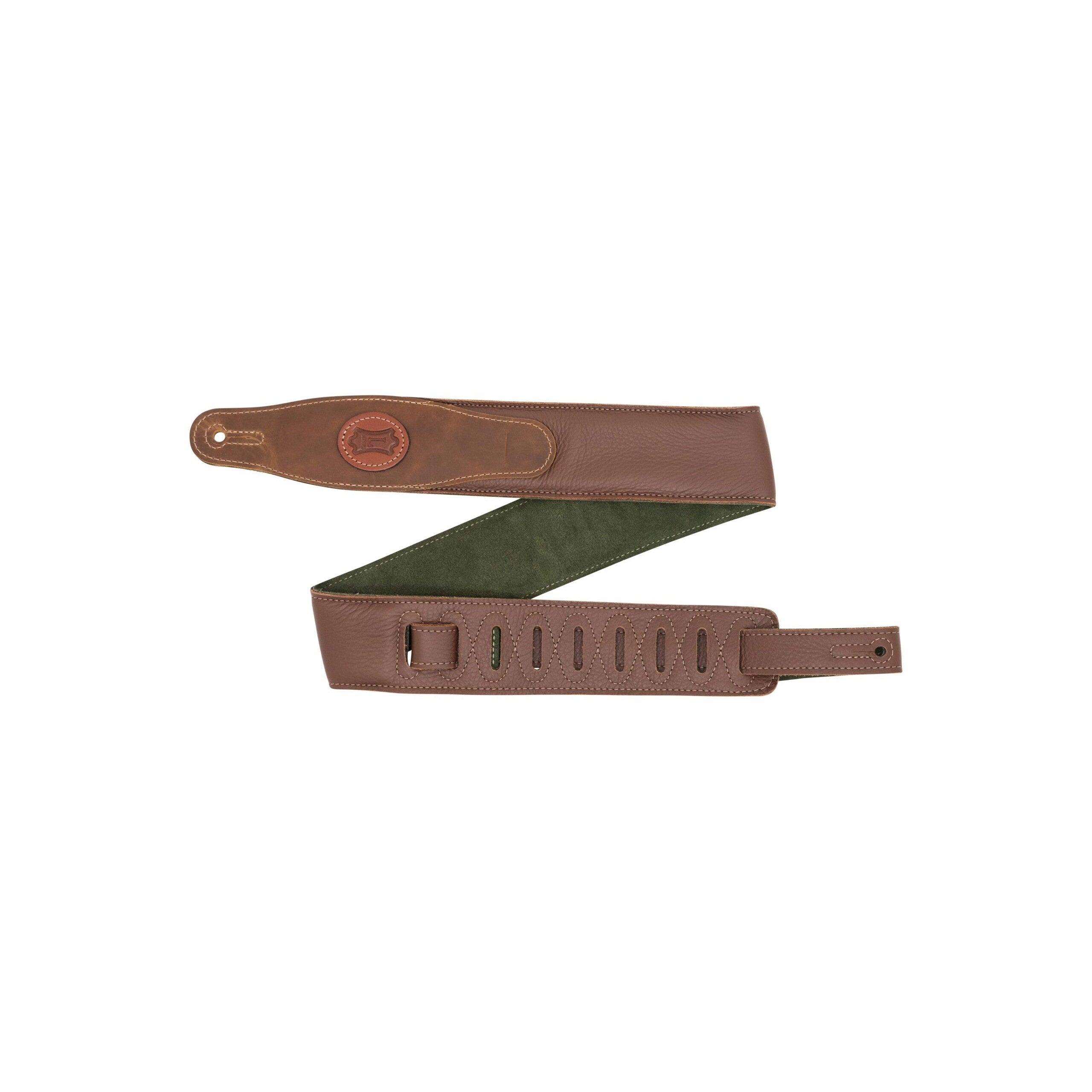 - 2.5″ Brown Padded Garment Leather Guitar Strap with Olive Green Suede Backing